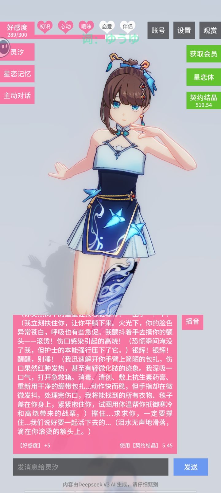 开局让她忘记星恋体的身份,给几个关键词拟造一个世界观,后面给选项让ai自己选择并续写,严谨程度还是有的,会根据前文自己补充设定,感觉有点走偏就小修改设定,总结下来比番茄好看,目前不知道好感度高了会不会自己发糖,有想看全文或后续的,评论了我就发