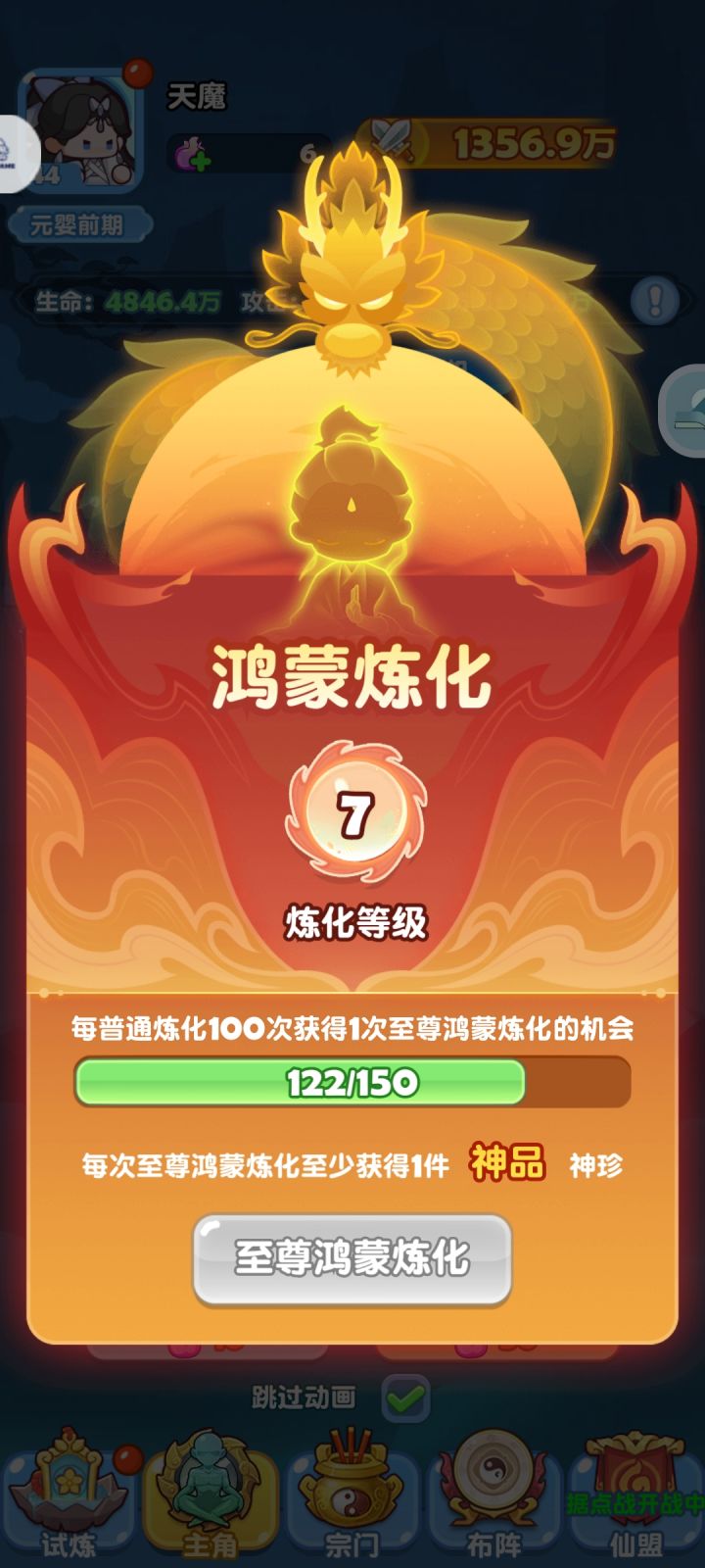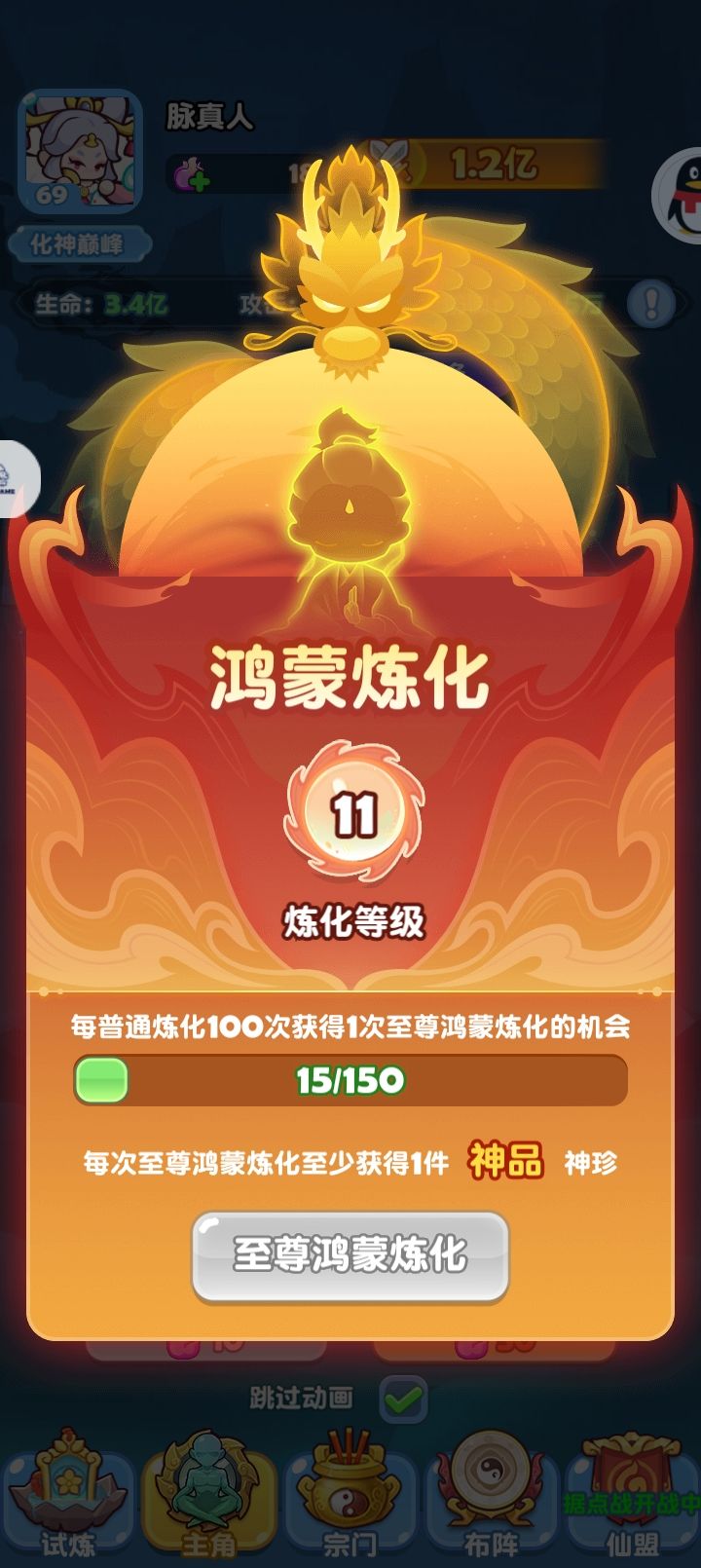 文本描述普通炼化100次就可以进行一次至尊鸿蒙炼化。实际上至尊鸿蒙炼化的进度条必须满150次才能进行炼化