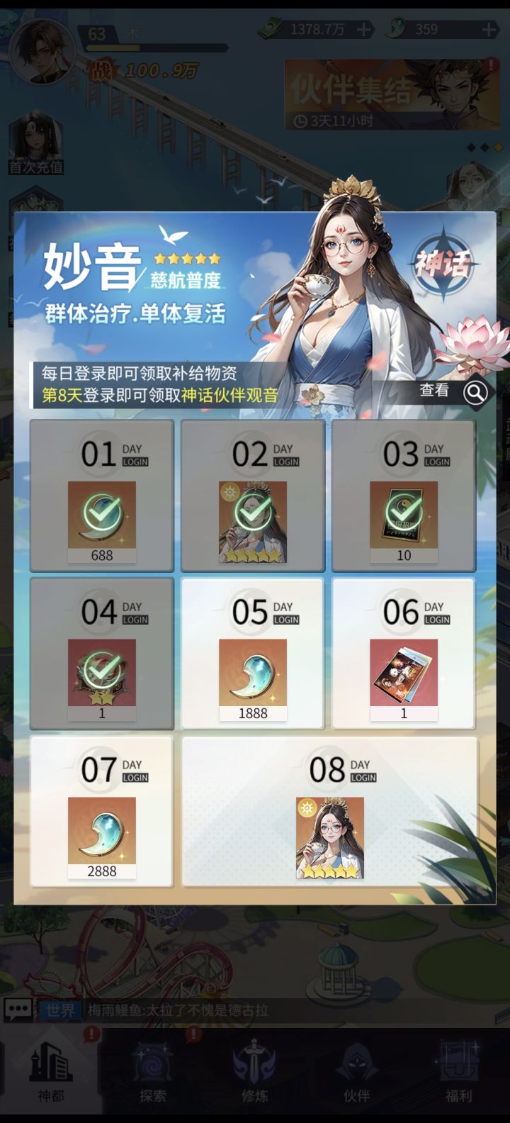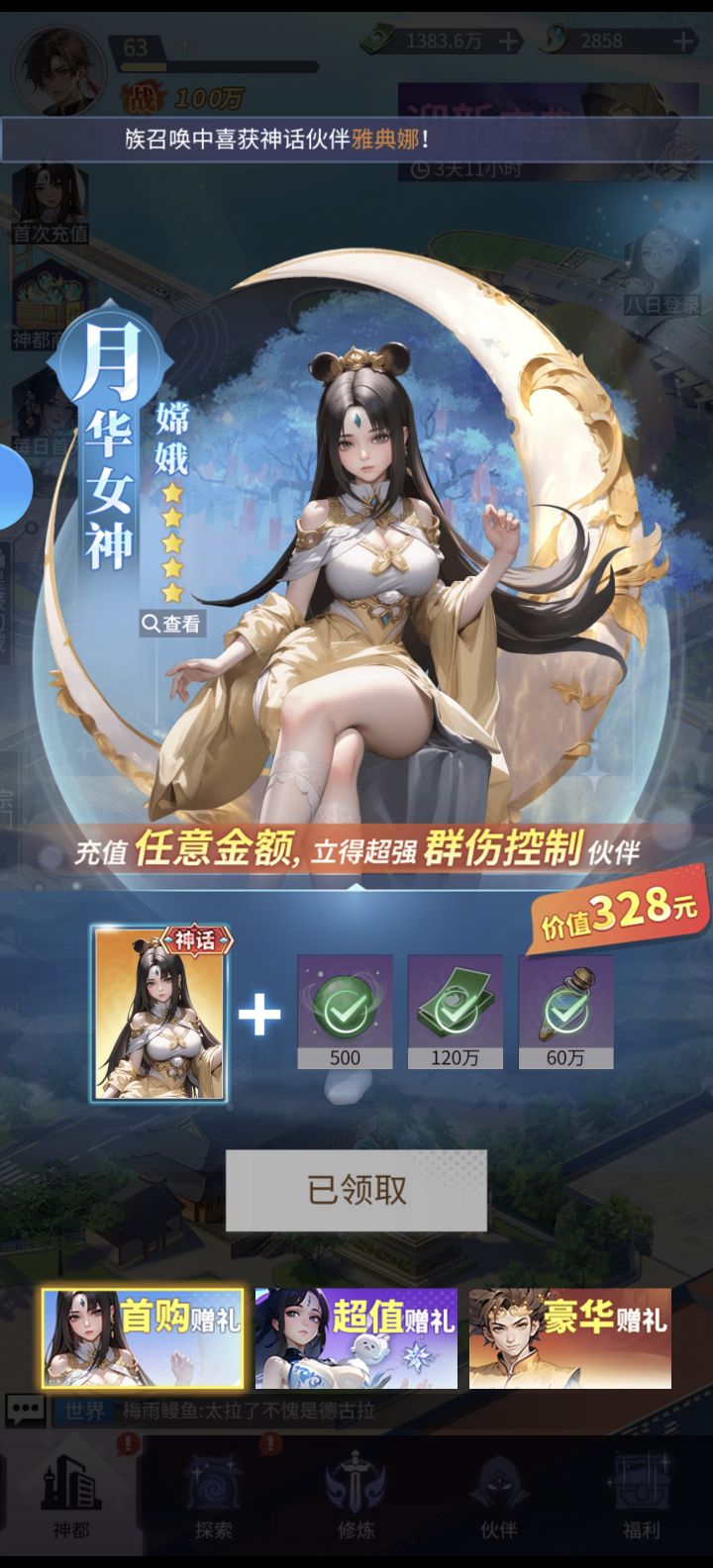1.当我们完成主线也就是卡等级之后就需要考虑我们的主C,平民只推嫦娥和阎罗,但是阎罗需要十星才能发挥效果,并且有苛刻的前置条件,所以开局不推荐当主c用。嫦娥的获取条件就比较友善,等到20级会触发千抽奖励,如果有阎罗或者嫦娥可以秒选,如果没抽到可以重开,累充6元和98元外加千抽总共获得三只可以升到九星。2.做完主c就要说配对,庆典活动外加伙伴动员可以得到两只阎王,如果运气好招募到了也可以升到九星