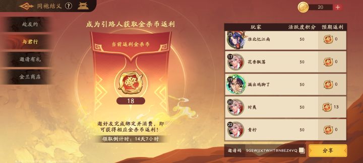 兑换码如下(礼貌自取): sgswjjx 35qidong wjjxzhenhaowan wjjx666 wjjx999 玩三武摘金桃 三武天降金桃 25级前可用 稳定拿完奖励邀请码: SGSWJJXHTI7GXAEGI2H