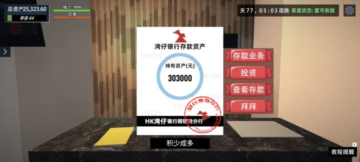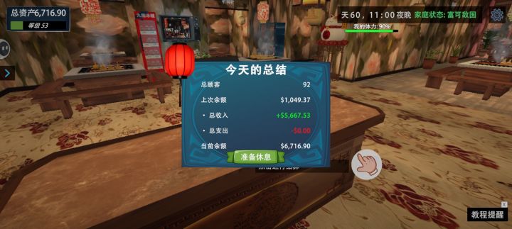 #我的关东煮小铺 #我的关东煮小铺攻略 #我的关东煮小铺建议 #我的关东煮小铺装修 我目前情况如图,开业77天没算家居花了多少,但光是名画就15w➕了,其他家居也买的都挺贵的,粗略算下来就差不多按25w来说吧,图左上角手中现金2.5w,银行存款如最后一张30w,加在一起77天净利润60w左右,应该还会多点前期不要买家具纯搞钱把所有包厢开完,后期再摆满高级食材桌子高级食材虽然顾客买的少但一个