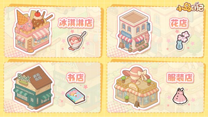 ✨噔噔噔——小岛最令人期待的商业街终于正式开放啦!这里有吃有逛有玩,简直是小岛生活的完美补给站~🍦「甜品店」:彩虹漩涡冰淇淋、会发光的梦幻星球杯,每一口都是甜蜜暴击!🌸「鲜花店」:带着露水的玫瑰、永远向阳的向日葵,早上起床来这里买一束fafa吧~📖「书店」:书架上有各种各样的故事书,悄悄告诉你,深夜书架还会发光哦~👗「服装店」:试衣镜会夸彩虹屁!试穿公主裙会自动配BGM,岛民专属穿搭AI