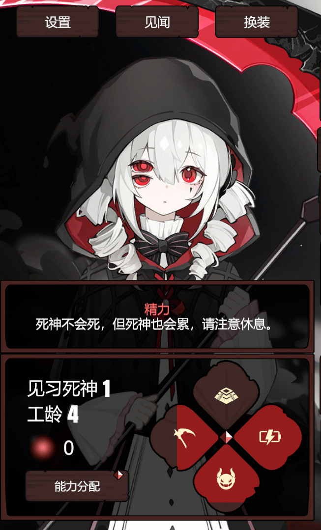 开局让你可以睡觉的地方,可以一直睡觉睡到满精神,并不会直接结束,而且满了也可以无限睡觉睡到大道磨灭,建议整个睡觉睡到大死神收人的怠惰剧情分支还有对死神塔的信仰,开局跟其他死神能聊到0还不结束,只有过了几遍收割不杀人才死(杀人大多长信仰)打工?为什么要打工?死前这么累,死后多摊摊也是合理的吧?什么你是大死神?谁?不认识眼里没有丝毫对死神的敬畏,有的只有对摸鱼的渴望。
