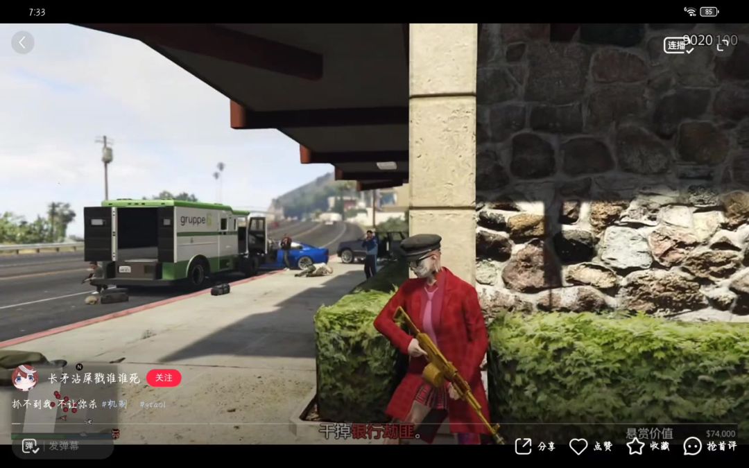 游戏地点就在金库公敌的那个银行,旁边有一辆运钞车在抢钱,然后后面还有警察帮我们一起打,任务是阻止运钞车抢钱!#五星好市民 #五星的好市民