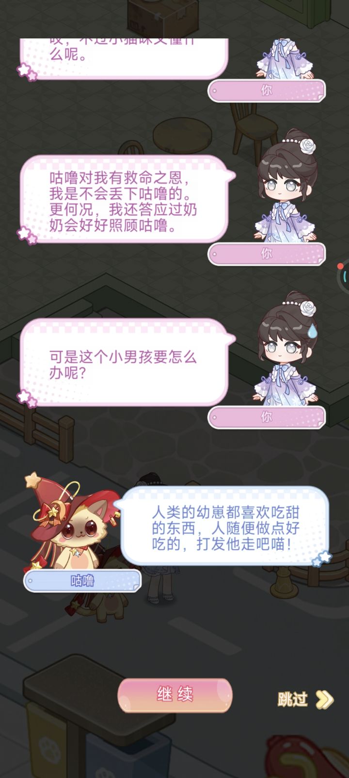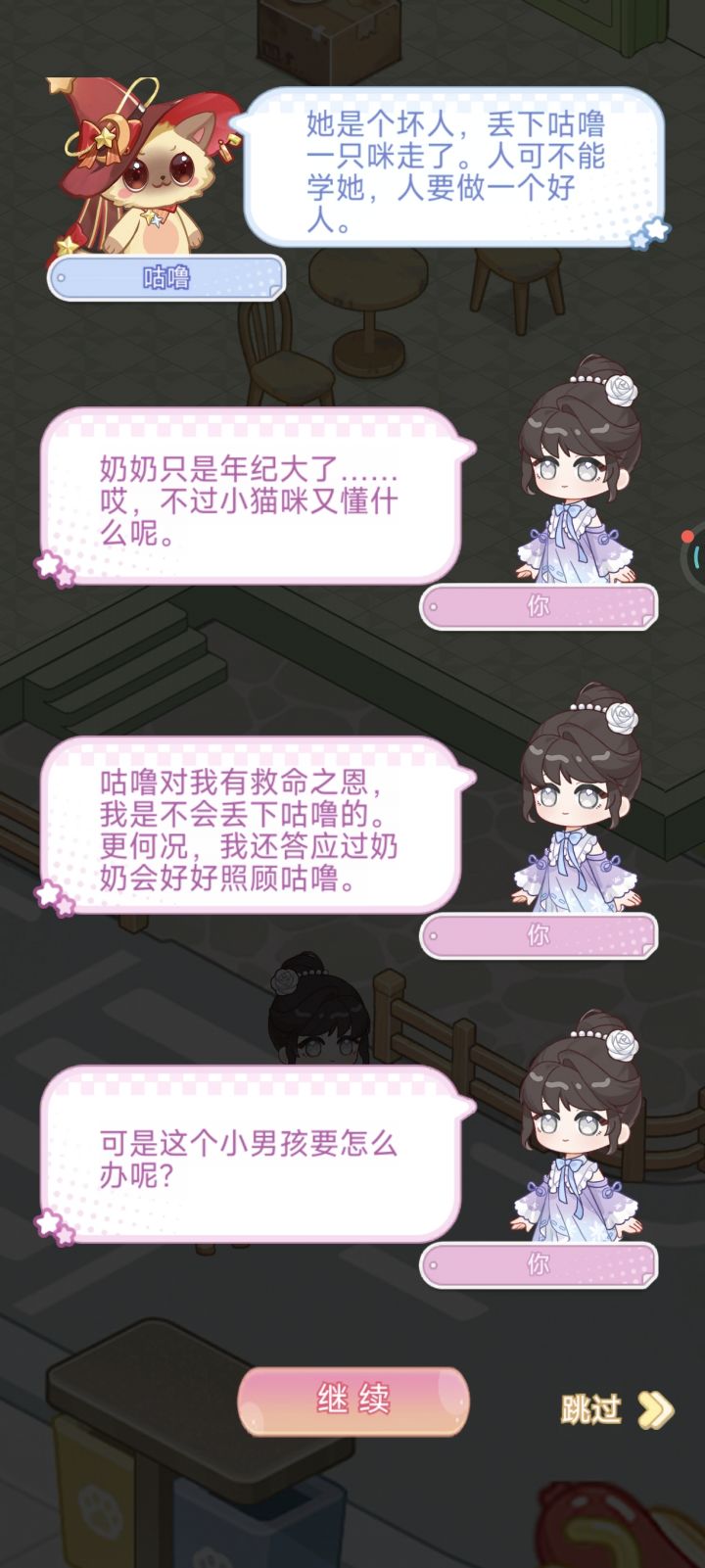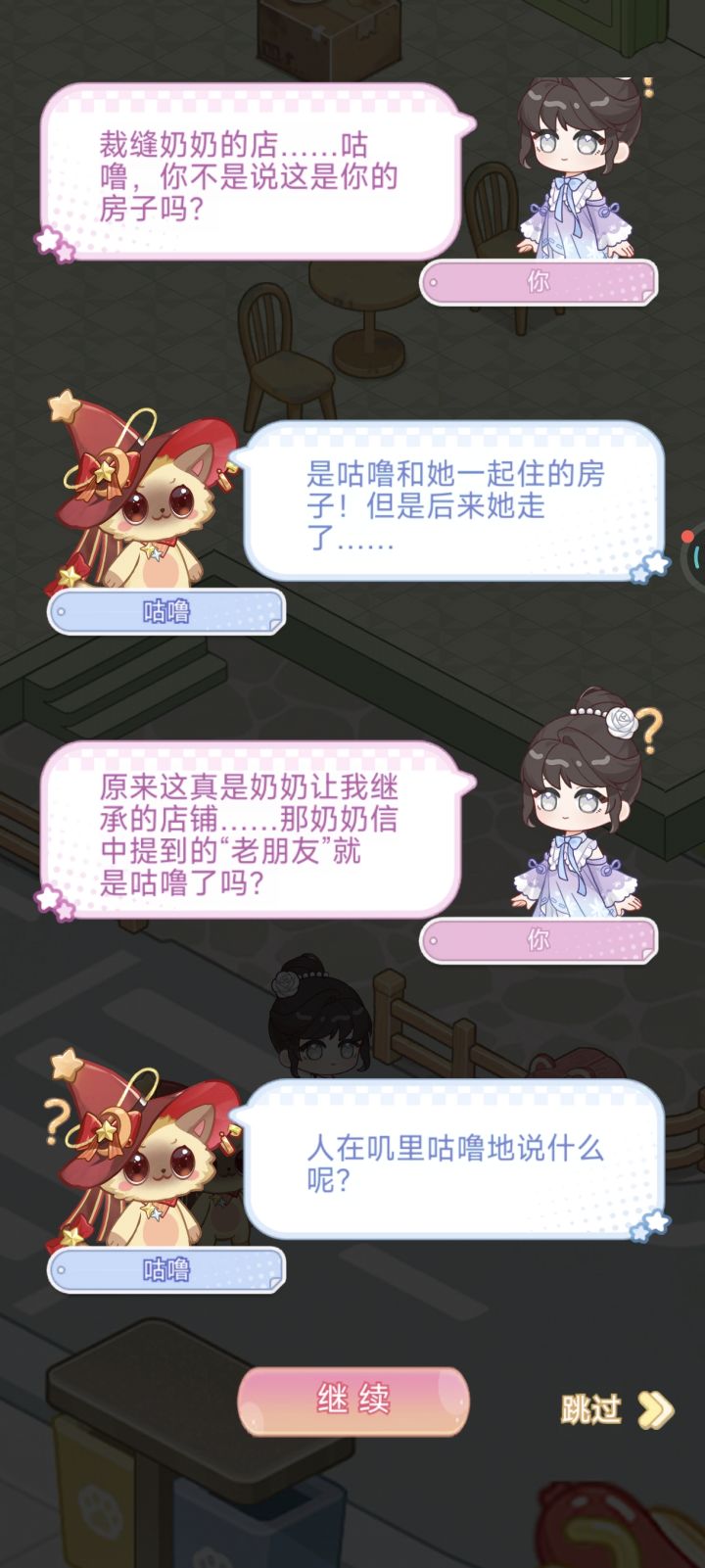 我:裁缝奶奶的店……咕噜,你不是说这是你的房子吗?咕噜:是咕噜和她一起住的房子!但是后来她走了……我:原来这真是奶奶让我继承的店铺……那奶奶信中提到的“老朋友”就是咕噜了吗?咕噜:人在叽里咕噜地说什么呢?咕噜:她是个坏人,丢下咕噜一只咪走了。人可不能学她,人要做一个好人。我:奶奶只是年纪大了……哎,不过小猫咪又懂什么呢。我:咕噜对我有救命之恩,我是不会丢下咕噜的。更何况,我还答应过奶奶