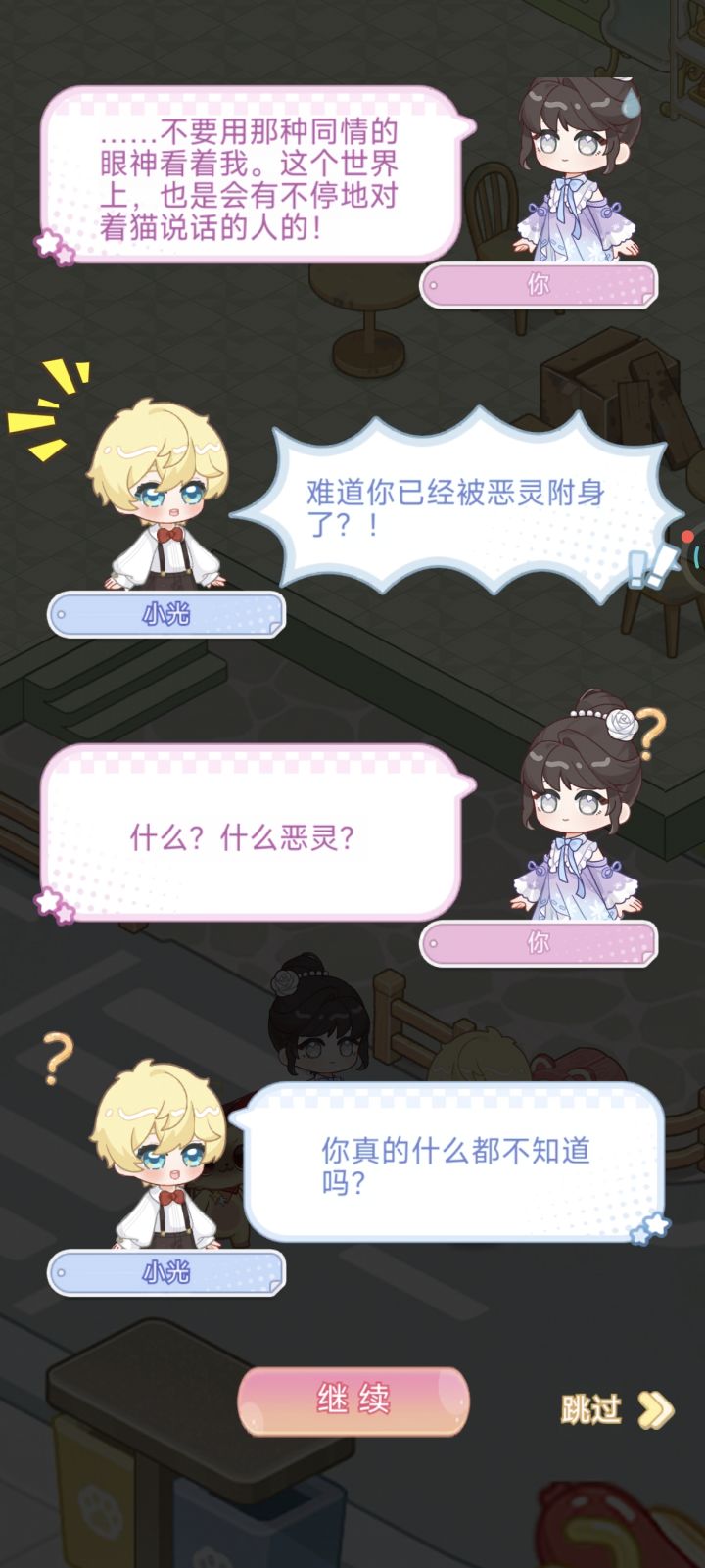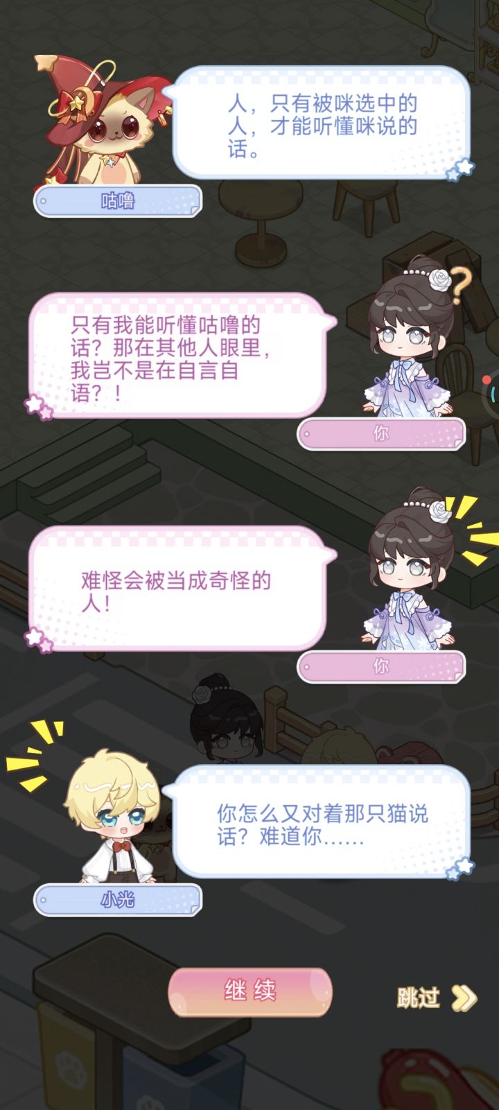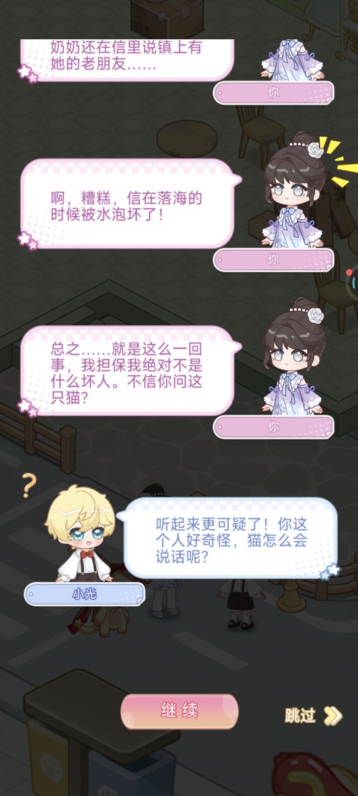 我:裁缝奶奶的店……咕噜,你不是说这是你的房子吗?咕噜:是咕噜和她一起住的房子!但是后来她走了……我:原来这真是奶奶让我继承的店铺……那奶奶信中提到的“老朋友”就是咕噜了吗?咕噜:人在叽里咕噜地说什么呢?咕噜:她是个坏人,丢下咕噜一只咪走了。人可不能学她,人要做一个好人。我:奶奶只是年纪大了……哎,不过小猫咪又懂什么呢。我:咕噜对我有救命之恩,我是不会丢下咕噜的。更何况,我还答应过奶奶