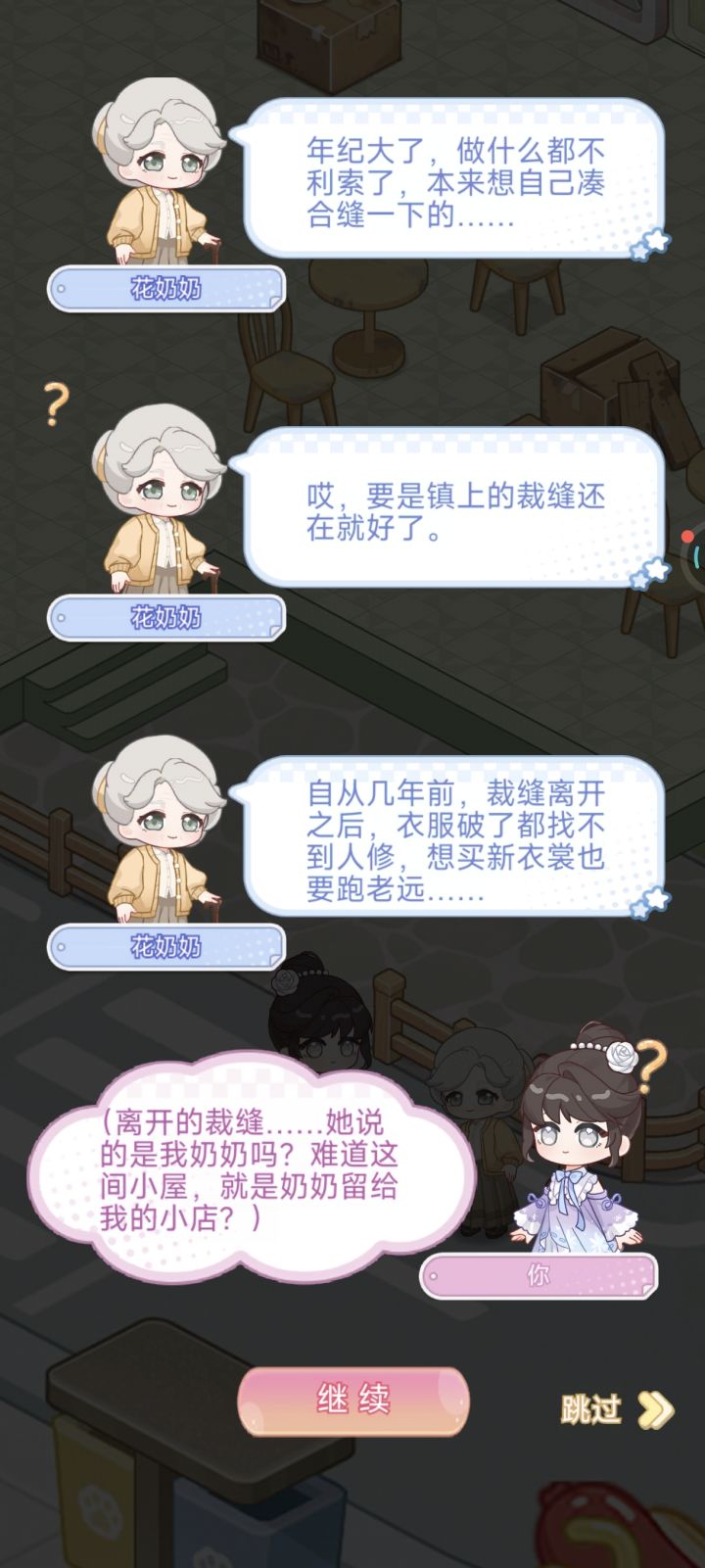 花奶奶:年纪大了,做什么都不利索了,本来想自己凑合缝一下的……花奶奶:哎,要是镇上的裁缝还在就好了。花奶奶:自从几年前,裁缝离开之后,衣服破了都找不到人修,想买新衣裳也要跑老远……...我:(离开的裁缝……她说的是我奶奶吗?难道这间小屋,就是奶奶留给我的小店?)我:(如果真是这样,咕噜又为什么会一直住在这儿呢?)#绘梦日记 #绘梦日记剧情