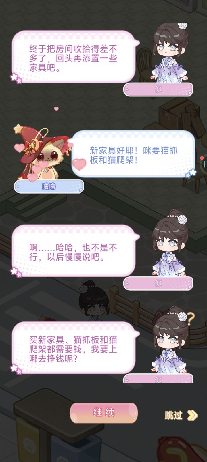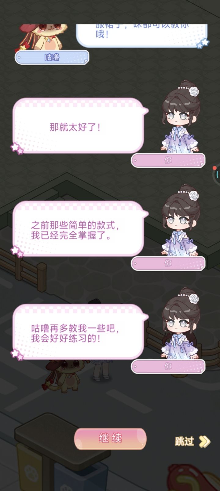 我:咕噜,你觉得我们在镇上开一家服装店怎么样?我:卖衣服的钱,不仅可以给你买很多鱼吃,还可以买猫爬架和猫玩具哦!咕噜:服装店?好呀,咪最擅长这个了!咕噜:你还想做什么款式的衣服裙子,咪都可以教你哦!我:那就太好了!之前那些简单的款式,我已经完全掌握了。我:咕噜再多教我一些吧,我会好好练习的!#绘梦日记 #绘梦日记剧情
