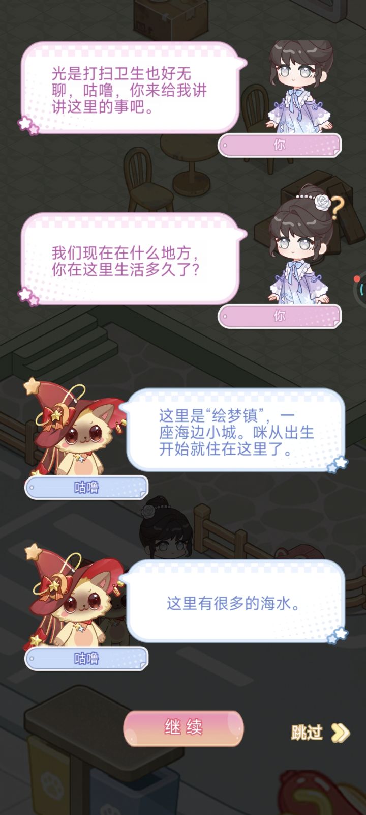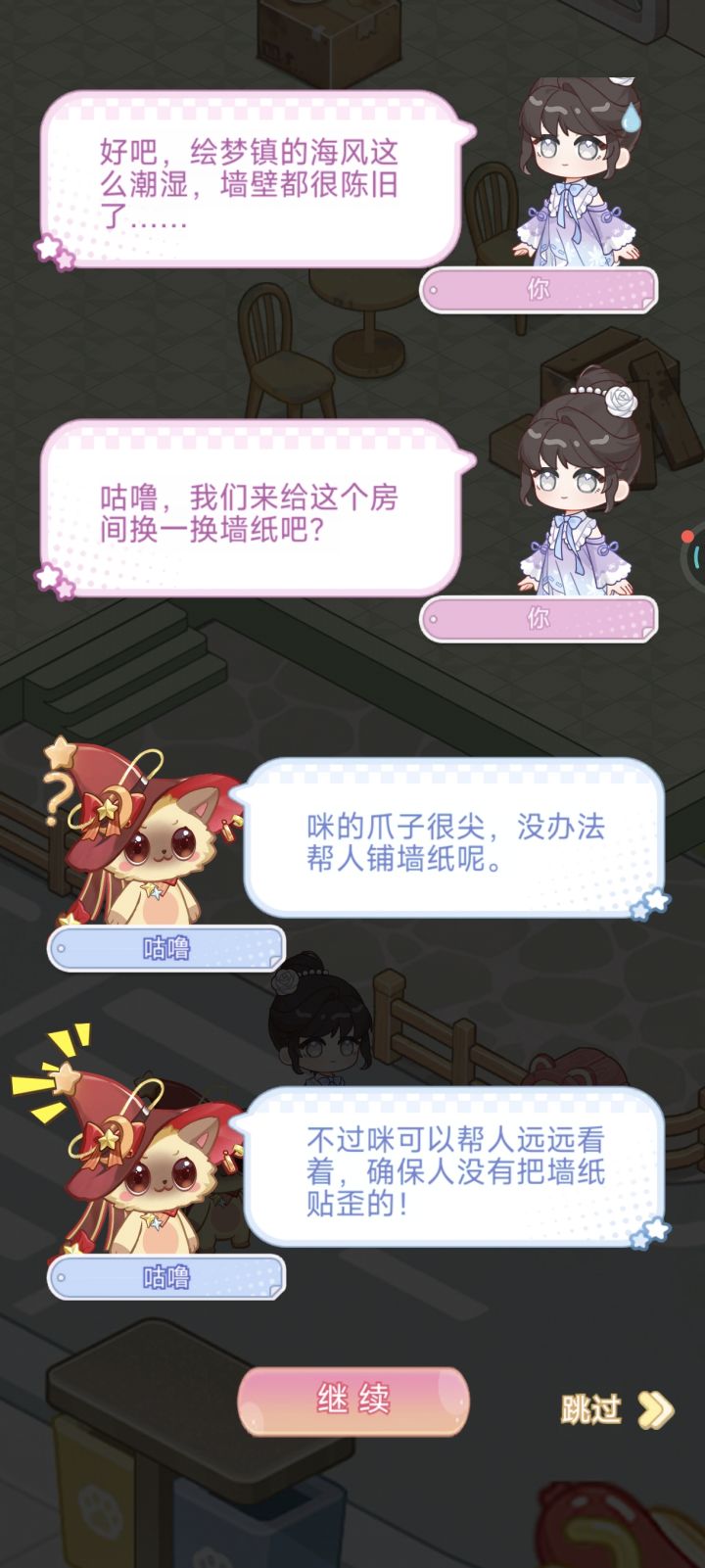 我:光是打扫卫生也好无聊,咕噜,你来给我讲讲这里的事吧。我:我们现在在什么地方,你在这里生活多久了?咕噜:这里是“绘梦镇”,一座海边小城。咪从出生开始就住在这里了。咕噜:这里有很多的海水。我:好吧,绘梦镇的海风这么潮湿,墙壁都很陈旧了……我:咕噜,我们来给这个房间换一换墙纸吧?咕噜:咪的爪子很尖,没办法帮人铺墙纸呢。咕噜:不过咪可以帮人远远看着,确保人没有把墙纸贴歪的!#绘梦日记#绘梦日记剧情