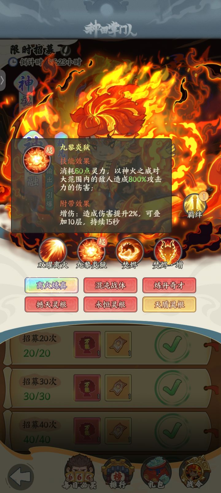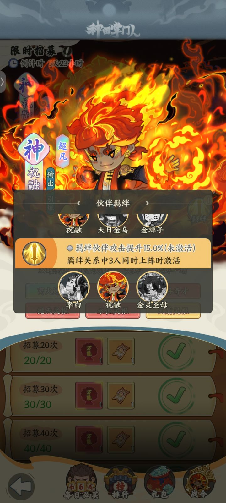 《祝融》(#种田掌门人 )英雄品阶:神品超凡英雄获取途径:1.七天限时活动招募拉满,200抽保底。2.每日必买商场英雄礼盒(要有本体,不然碎片用不了)专属祝融皮肤:炎煌神君类型:伙伴皮肤祝融身披炎煌,神光万丈,以神君之姿挥手间焚天煮海,让敌人在炎煌怒火中化为灰烬拥有后【祝融攻击力+3%,攻击力+1200】(如果有皮肤情况会转化为50个碎片)获取途径:目前只有祝融限时七天活动。专