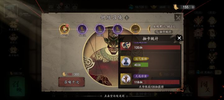 你这个有点毒了吧,而且看了抽卡记录,大多都是115抽左右才出,到现在为止一个十绝阵没有