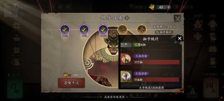 这游戏120抽保底,也就是3600个给个随机天书,然后给2个重复了,天书3级才有第二效果,那我不白抽了,头一次看到抽奖运气不好就零收益的游戏,制作人是人啊,还有那个抽遗物,现在2.5w抽一次,打个双倍局才抽一次,一次10多分钟还不能挂机,纯逆天,别的提升还不大,浪费时间,浪费感情。