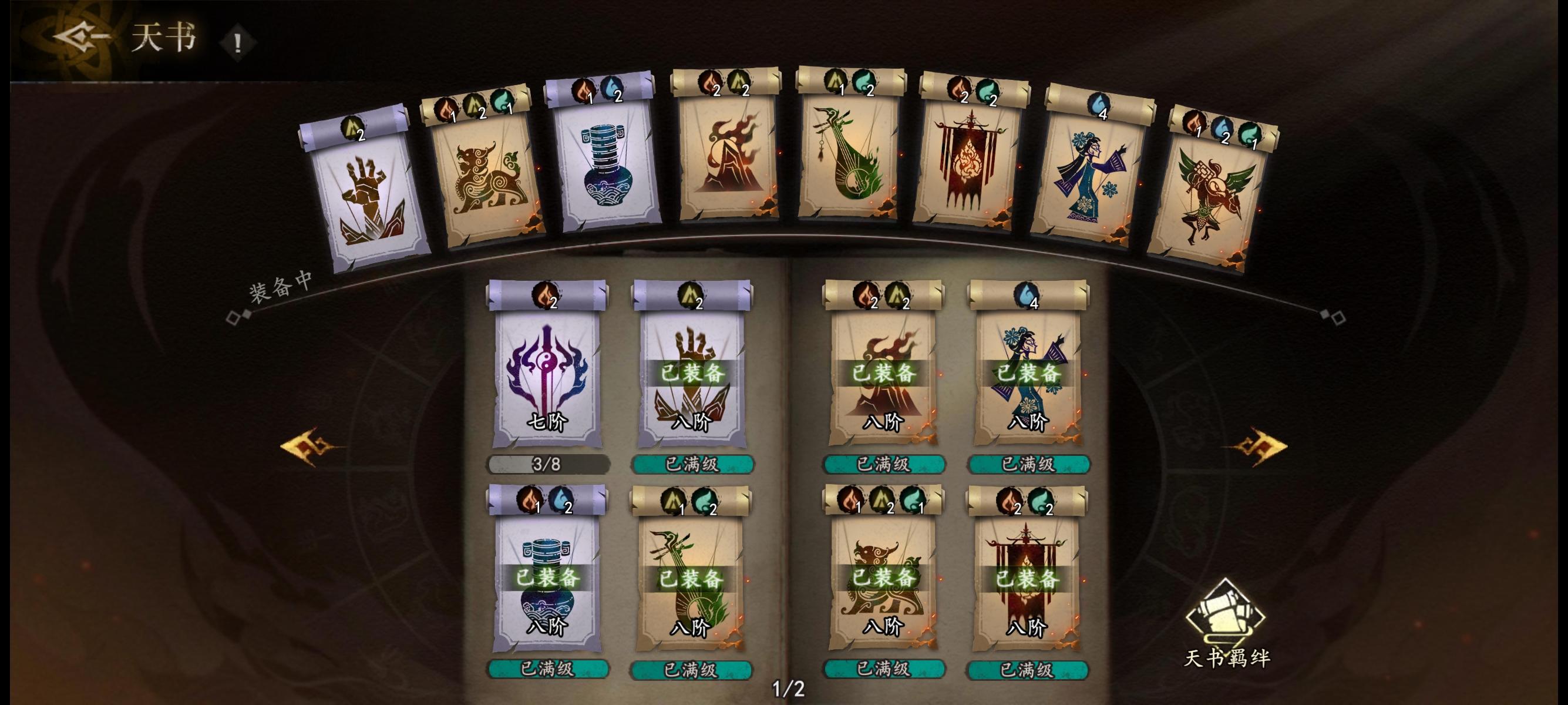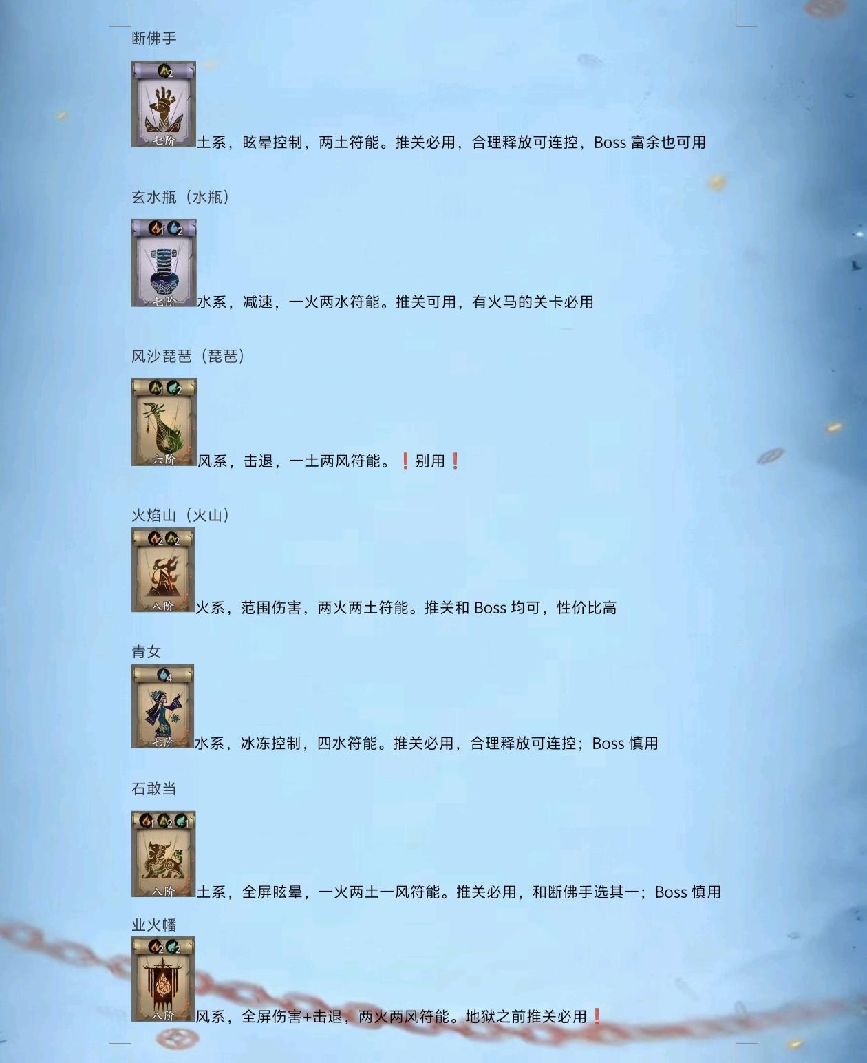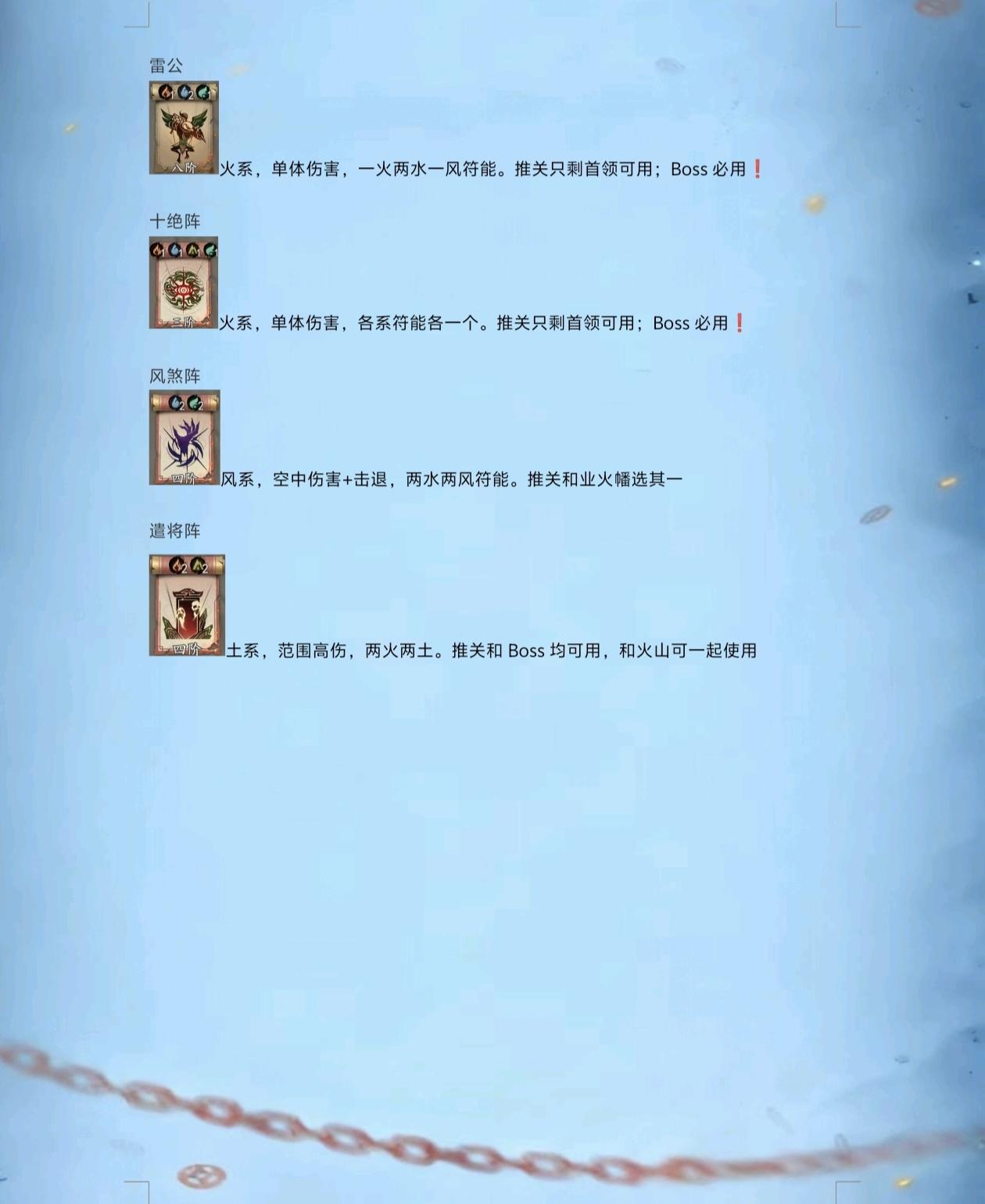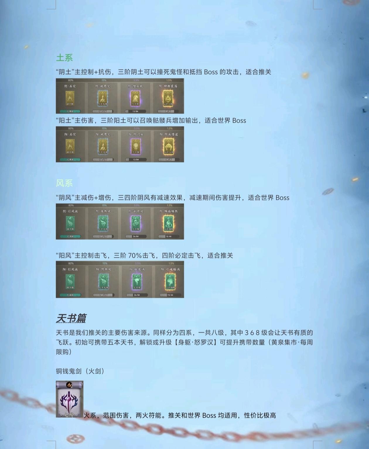 地狱之前,6阶业火YYDS。天书六阶及以上选择:铜钱剑主攻, 火能量2点,杠杠的青女+水瓶 控制增伤, 水能量大头3阶风煞或6阶以上雷公 挂易伤, 也要水能量断佛手辅助+转换能量, 土能量有多火能量 敢当王辅助,50%增伤,就是能量消耗有点大,8阶时候更实用贫民基本主攻6本天书群攻,最后搞火山,攻击太分散自选天书硬要整个6阶优先级,先出控,断佛手、青女、水瓶之类;铜钱剑和雷公后跟
