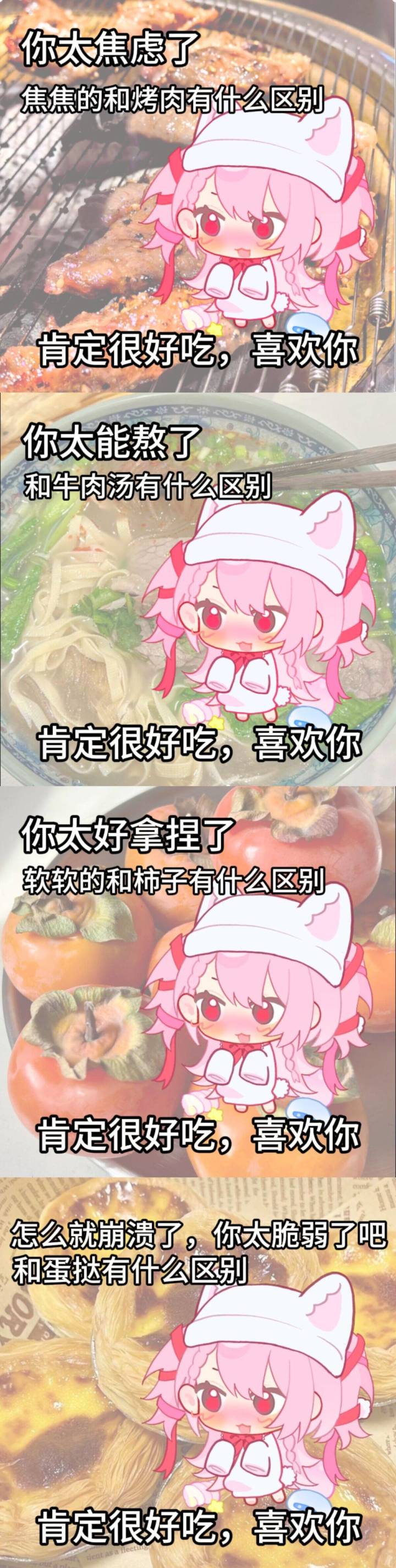 你太焦虑了和焦焦的烤肉有什么区别肯定很好吃,喜欢你🥰你太能熬了和牛肉汤有什么区别肯定很好吃,喜欢你😋你太好拿捏了和和软软的柿子有什么区别肯定很好吃,喜欢你☺️怎么就崩溃了,你太脆弱了吧和和蛋挞有什么区别肯定很好吃,喜欢你🤩#二创发电机 #梗图