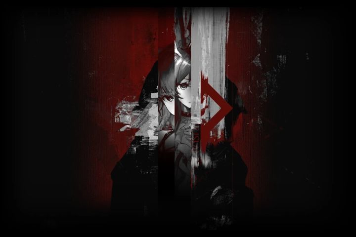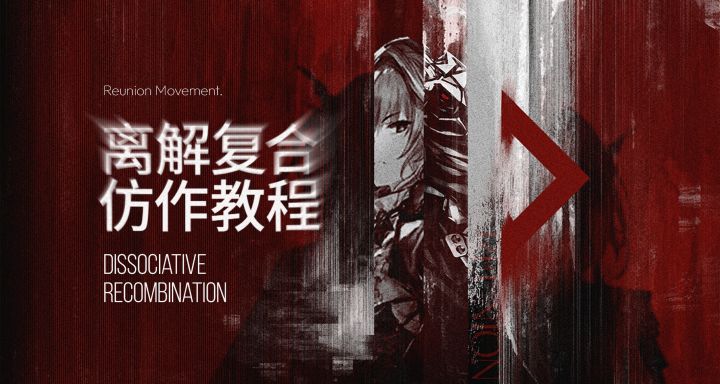 看一眼原图大方向上先关注两个问题1.离解?离解体现在破碎的油墨笔刷、被蒙版分割的人物、消解的菱形和被遮挡的文字。2.复合?复合体现在元素的集中分布与轮廓重合上。细节上注意这些问题1.背景的质感注意其中黑、红、暗红等颜色的分布与形状。2.对人物立绘的色彩加工需要注意他们的暗面亮面分别什么颜色,以及需不需要调整基本明暗分布。3.破碎需要注意破碎的形态、质感以及颜色。4.文字经