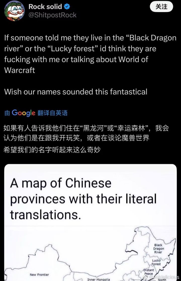 网上冲浪的时候看到个有意思的:有老外机翻了中国地图,接着就被“黑龙之河”、“幸运森林”、“广阔远东”等取名方式震惊了——在他们看来,中国就像是一个大型的游戏地图。不仅如此,这片土地上还有诸如“青色海洋”、“尚武银河”这样的城市名。今天我们就来聊点轻松的,你的“出生点”和“主城”在哪里?又能怎么翻译成酷炫的游戏地图名呢?#你说的对 #每日一聊 #游戏杂谈 #今天游戏圈发生了啥 #MMORPG #