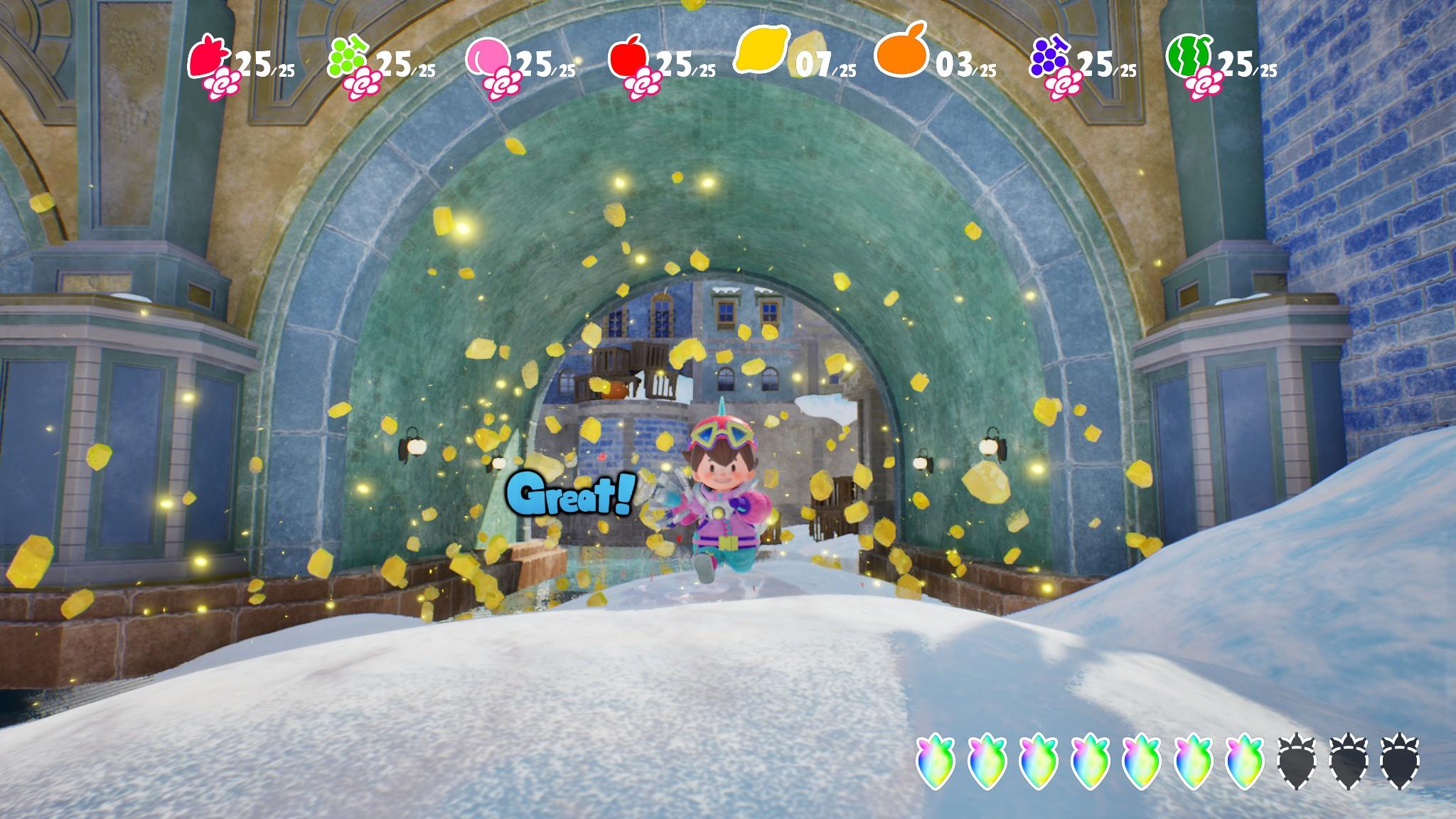 收集马拉松!《フルーティモ!》是一款以收集场景中的散落或者隐藏的水果为主要玩法的游戏,玩家将扮演一位喜爱水果的小男孩Vimita和他的伙伴背包机器人randpa一起探索庞大的水果公园Kajune Land收集自己喜欢的水果并放入最终的榨汁机!游戏的画风非常可爱,属于是想象中的童话乐园了,让玩家沉浸其中,里面的每一张截图都可以当做壁纸的程度!可爱有趣的局内交互和收集游戏中主角可以使用他的伙伴背