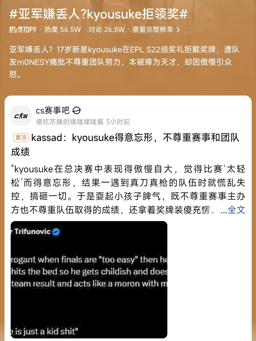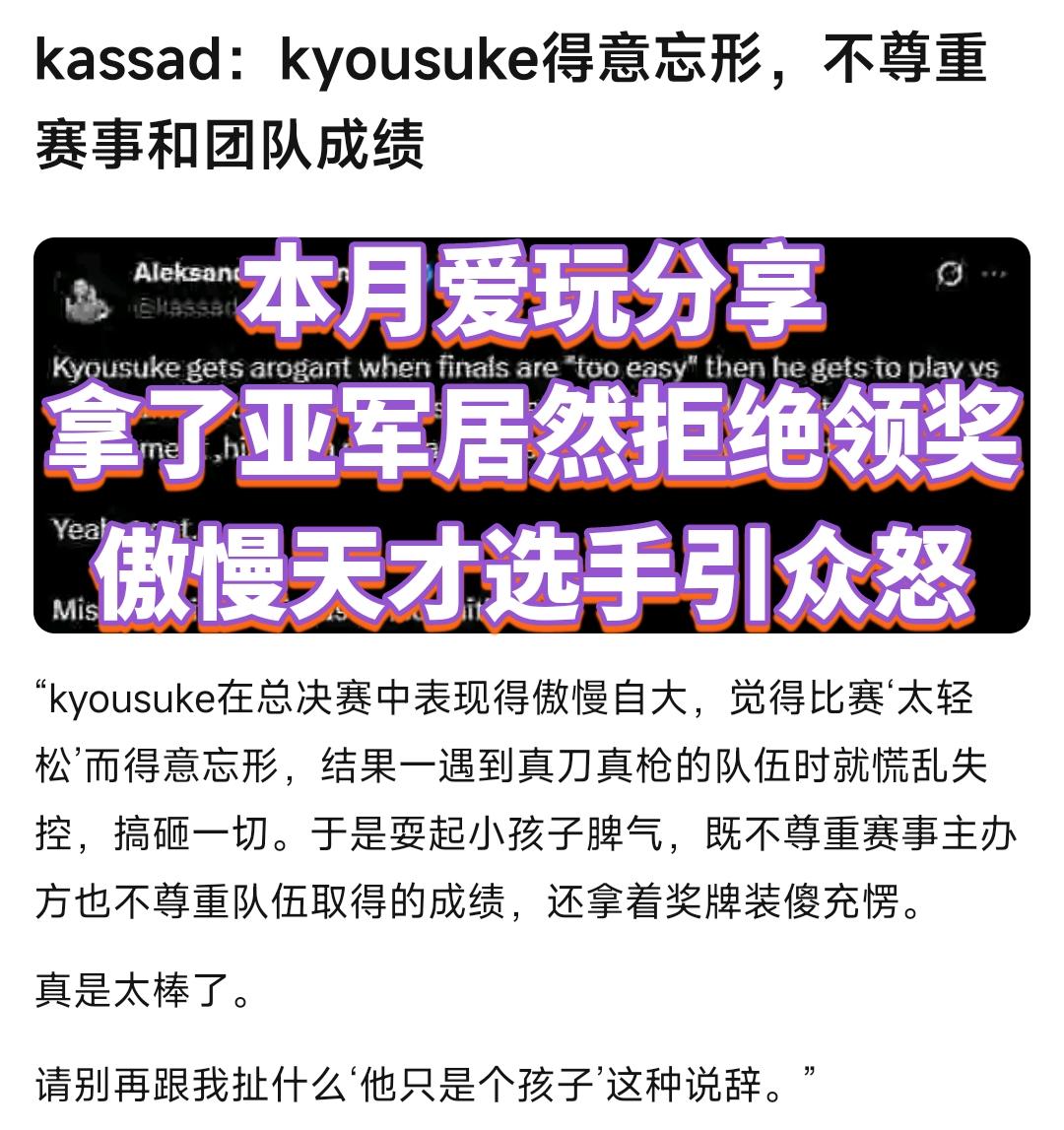 17岁新星kyousuke在EPL S22颁奖礼拒戴奖牌,遭队友mONESY痛批不尊重团队努力,本被捧为天才,却因傲慢引众怒。不懂得人情世故的天才,很容易就会因为意外凋零哦#主机单机 #游戏资讯 #反恐精英2 #cs2