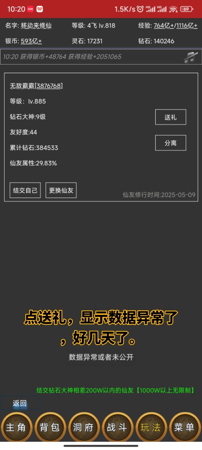 玩法里,钻石仙友,点送礼,显示数据异常,好几天了。及时排查问题哦