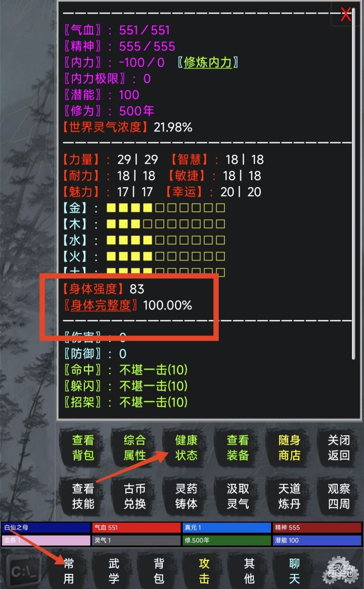 萌新入坑游玩注册[账号] 登陆[创建角色]创建好角色会进入地图[转生殿]点击忘忧池进行洗点目前游戏属性分别是[力量][智慧][耐力][敏捷][魅力][幸运]以及五行灵根 金,木,水,火,土力量:攻击伤害上限下限。智慧:节省学习技能的花费,以及读书学习速度。耐力:身体机能与血量敏捷:防御闪避魅力:颜值幸运:各种副本,npc掉落物品(最玄幻没啥用)目前新手选择属性 推荐极端[力量