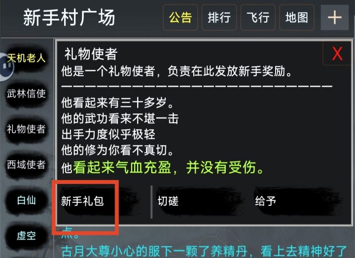 转生后落地新手村,玩家在广场可以看到左边有几名npc,分别是“天机老人,武林信使,礼物使者,西域使者”这时玩家只用注意[礼物使者]与他对话获得大自然的馈赠夺宝通用代指同义词:气血=血量 真元=内力 修为=经验大自然的馈赠馈赠对起步具有至关重要的作用双倍修为丹:击败npc获得修为(经验)时获得双倍修为(经验),有效时间一小时。双倍潜能丹:击败npc获得潜能时获得双倍潜能,有效时间一小时