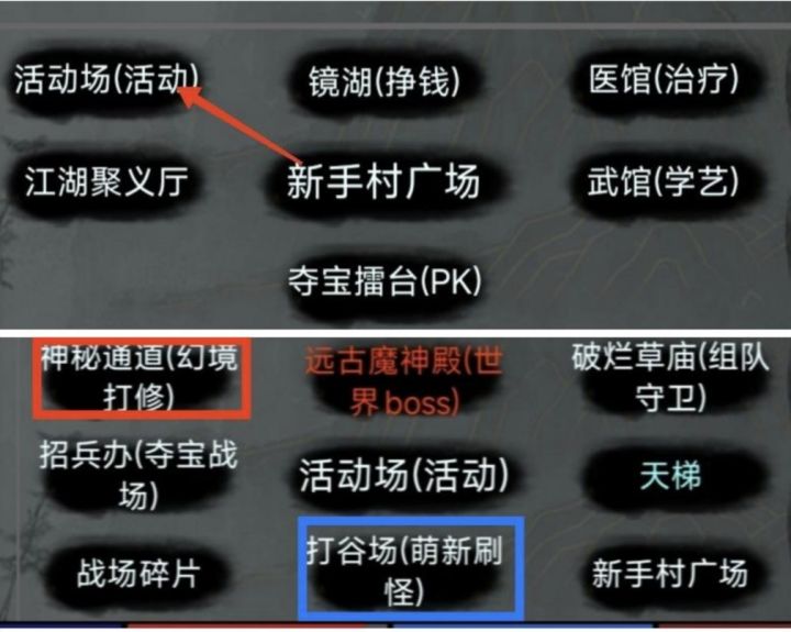上篇攻略我们说到如何研读基础0-31的基础技能,以及萌新拜入门派的位置,这期我们来说说学好技能以后如何提升修为。前情回顾:————————————————————————读完基础技能,拜入门派肯定是不够潜能学习特殊技能的,这时可以前往新手广场,在新手广场西北方有个活动场,进入以后有目前夺宝大多数副本玩法。萌新就从蓝色框的打谷场开始,进入打谷场击杀偷谷大山鸡即可获得修为潜能。单点太累可设置