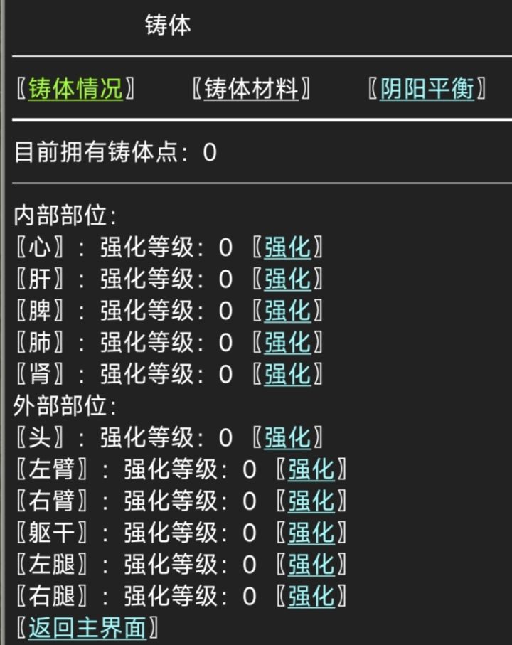 在前4期的介绍里夺宝世界的基本玩法与修为获取大家基本都了解清楚了,今天我们来了解夺宝世界内的分支体系练体,练体又称铸体、锻体通过外部药物刺激身体潜能达到以强化身体的目的。————————————————————————练体可强化的身体部位有“心、肝、脾、肺、肾、头、左臂、右臂、躯干、左腿、右腿”等11个部位,这11部位强化后分别是有什么加成呢?器官 心:增加精神。肝:减少身体组织恢复花费