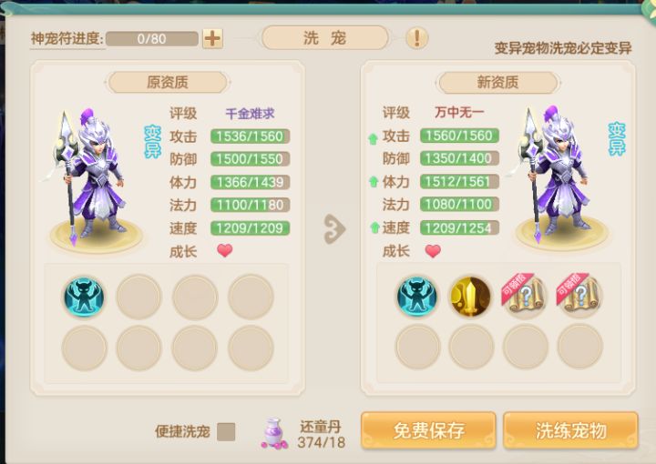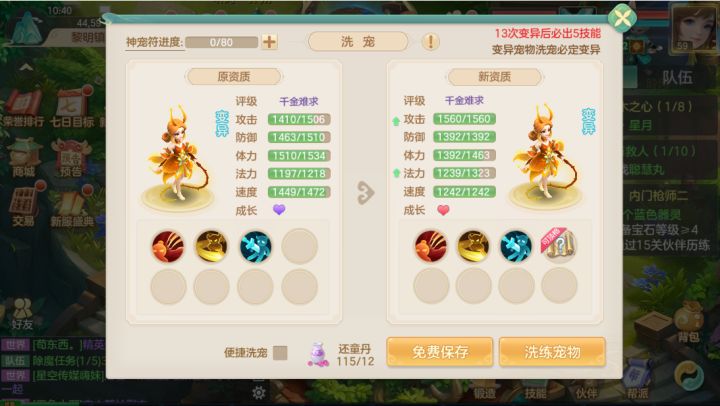 洗了只变异青藤姬,没想到变异之后洗宠贵了这么多也不知道洗的强不强,想问一下洗到什么技能或者特性可以停手?现在物宠主力就这一只青藤姬,法宠开服送的小灵狐还不能洗,很怕给她洗废是一定要5技能才能用吗?#梦想世界长风问剑录#发现好游戏#游戏日常