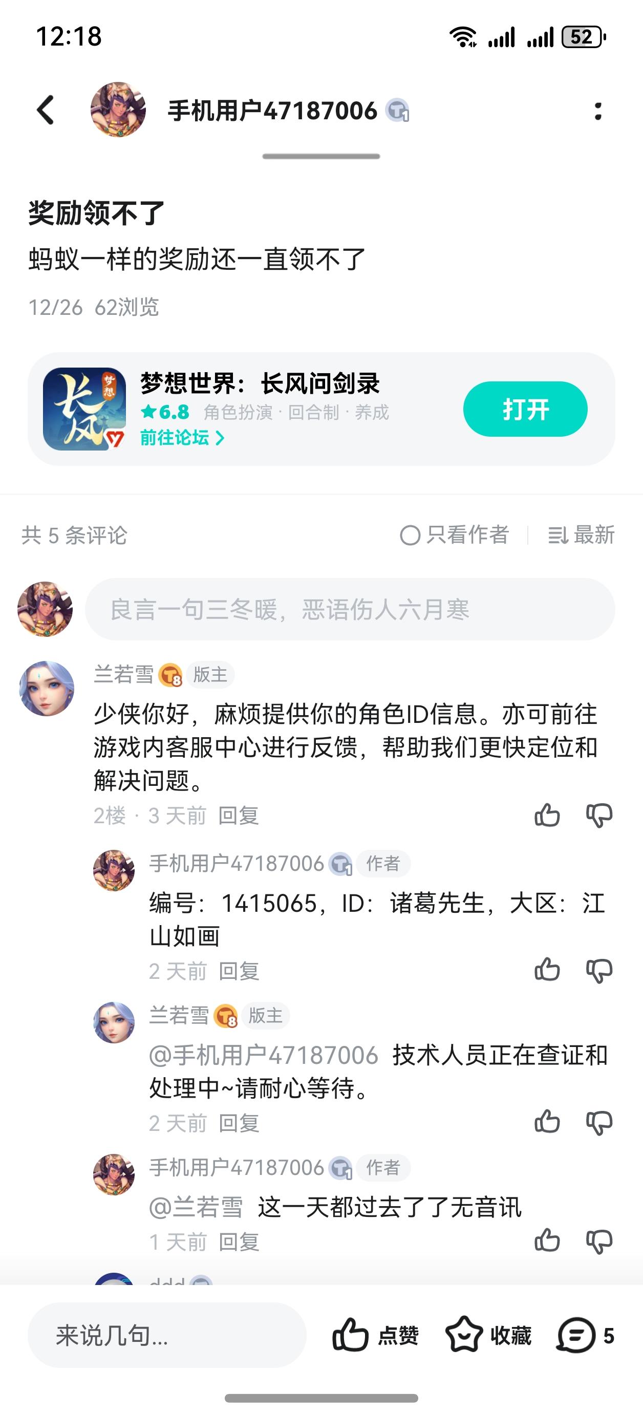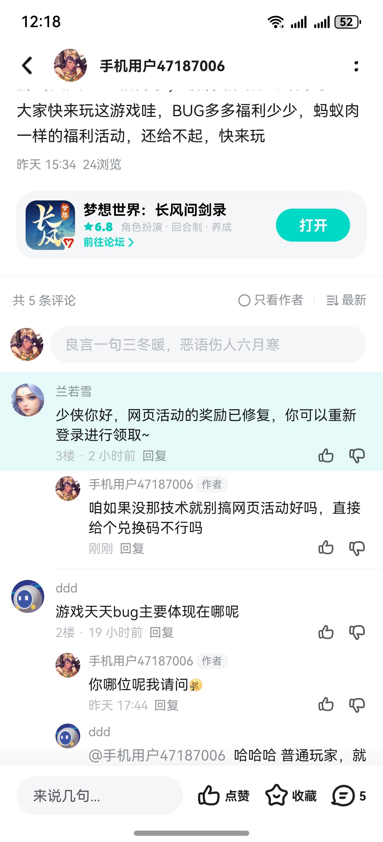 #梦想世界长风问剑录 #浅评一下 开服入坑玩家,充了200不到首先肯定一点,这个游戏玩法在回合制里有新意然后我来给大家讲讲在游戏里遇到的一些问题一、暗改精英难度玩过的老玩家可以出来讲一下很多时候上周随意过的精英难度,已更新,或者第二天一睡醒就打不过了尤其是更新69到70赛季时候精英三只明灯兔都能直接把玩家这边BB清完青蛙侠客剑气直接秒全图无任何更新通告无任何补偿然后过一天又