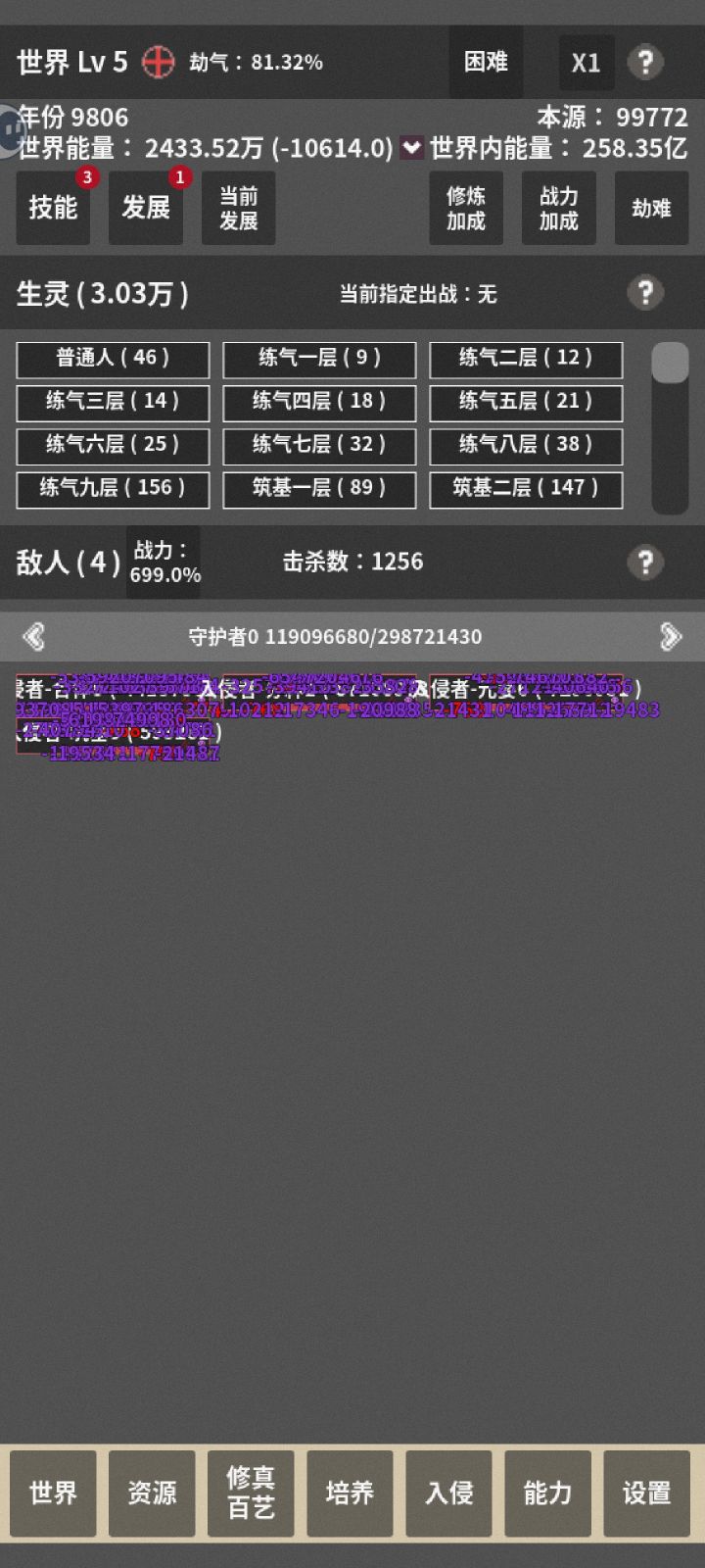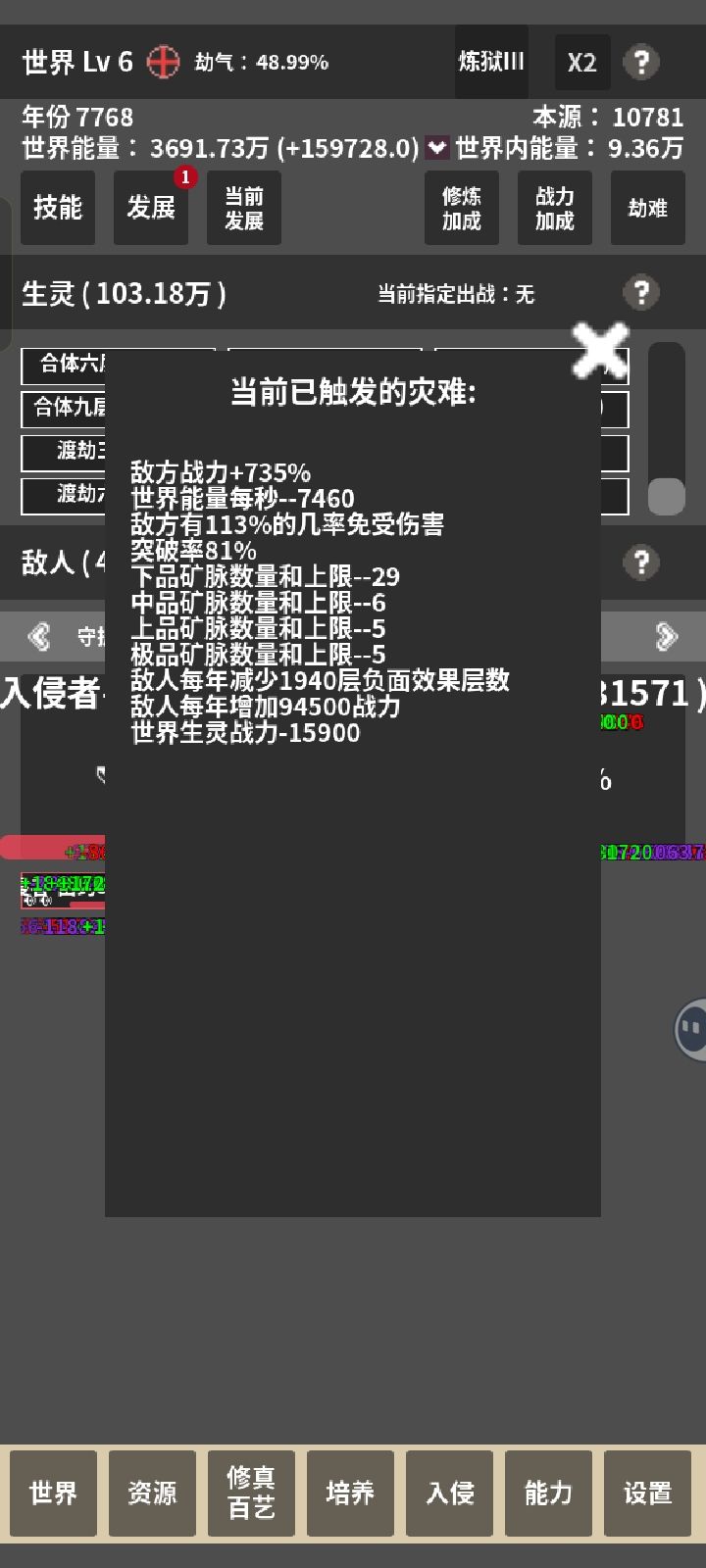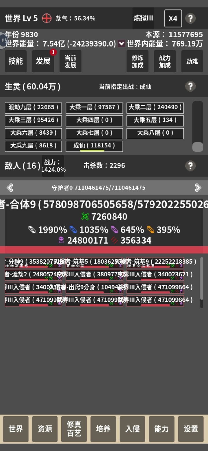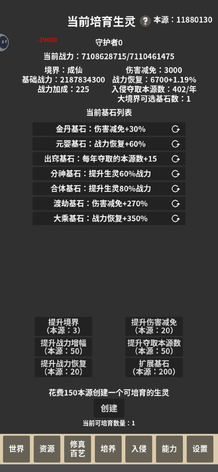 选了个减100%寿命加修炼速度的发展,然后几万生灵瞬间全部暴毙。随便点进去一个境界一看,寿命-1100多年。
