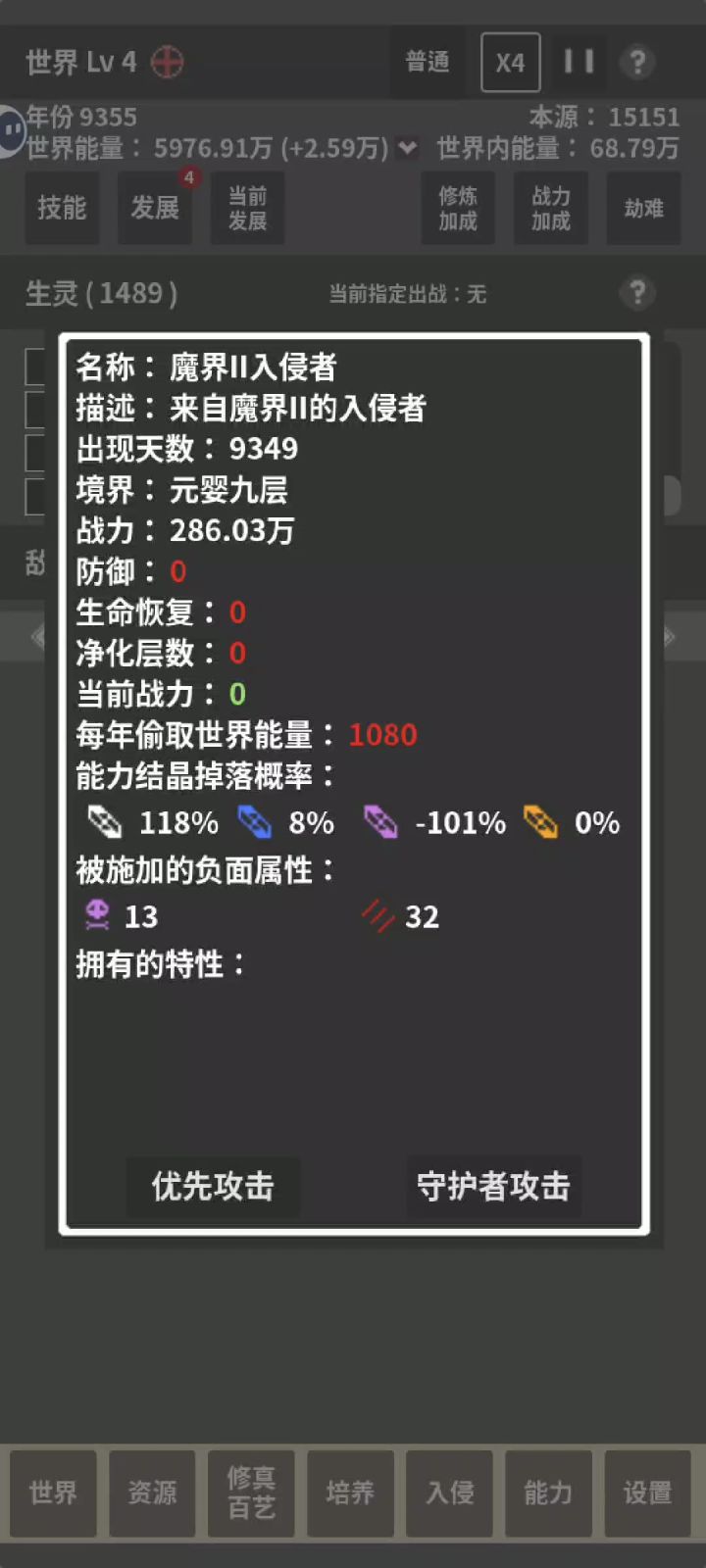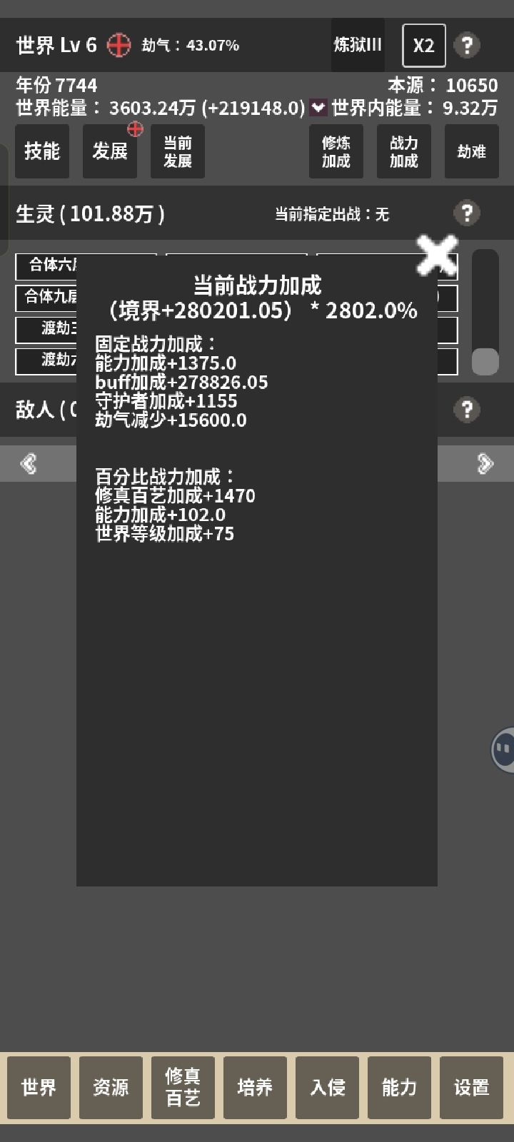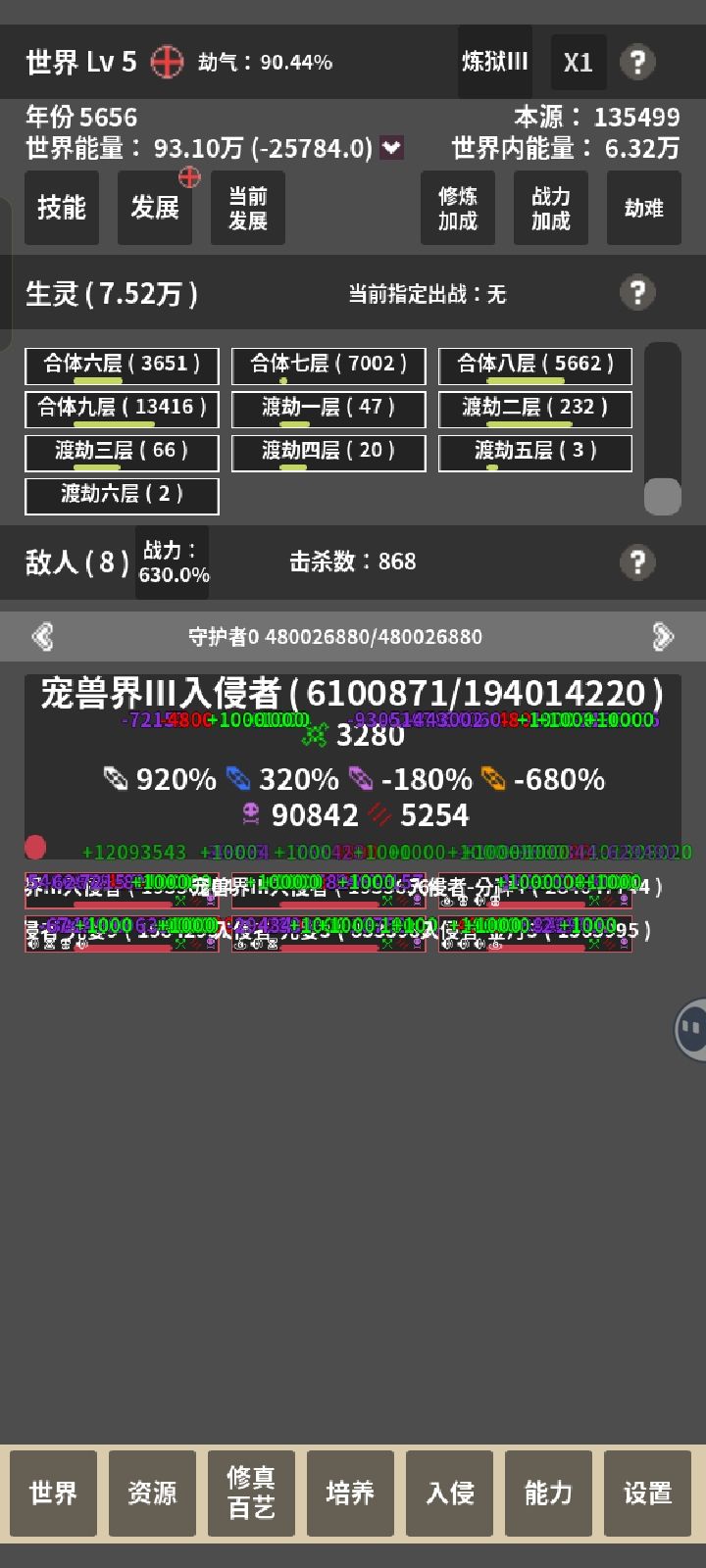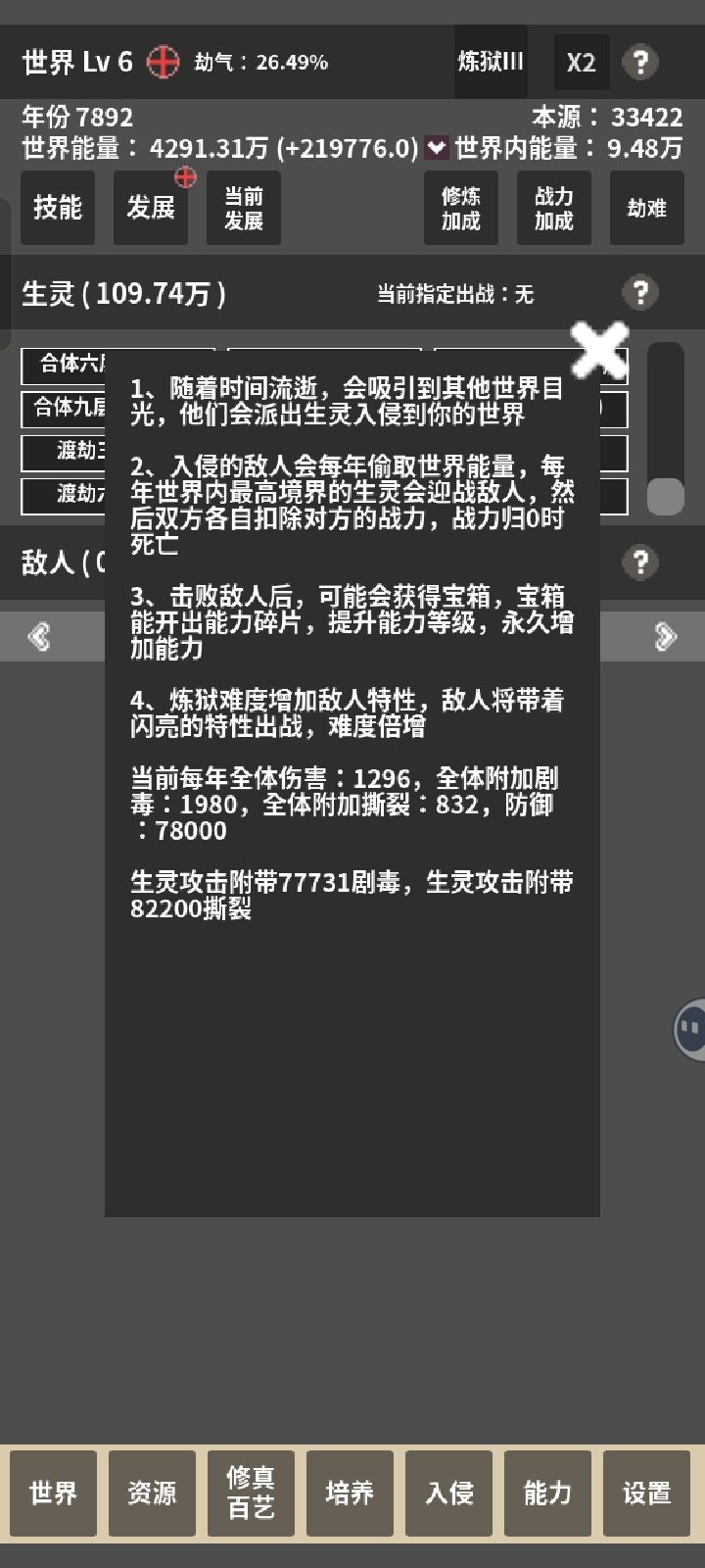选了个减100%寿命加修炼速度的发展,然后几万生灵瞬间全部暴毙。随便点进去一个境界一看,寿命-1100多年。