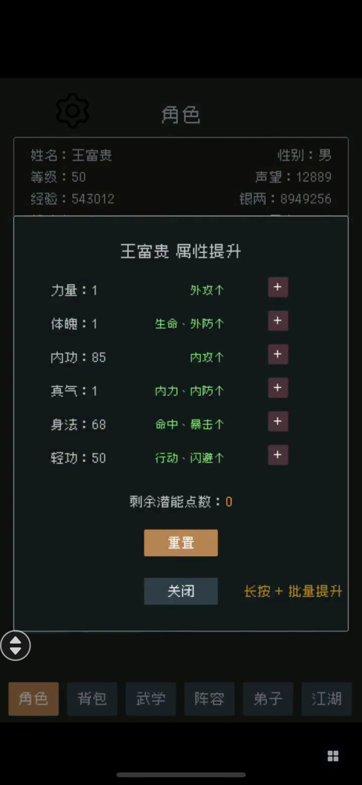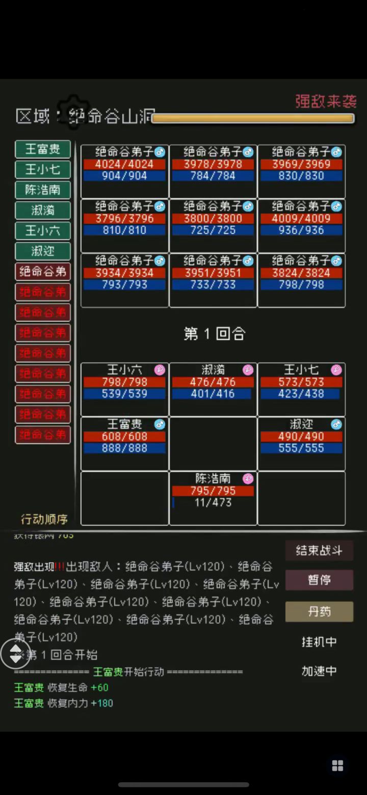这游戏总结下来就是拼先手,只要行动值过关,然后配合命中。武功招式就用新手的“大侠饶命”每个弟子都带。基本上就可以养老挂机升级了。PS 我目前 400 的行动就可以挂矿区的 120 级!