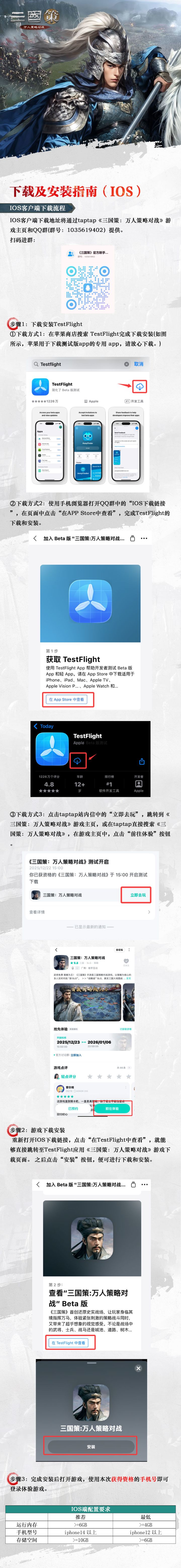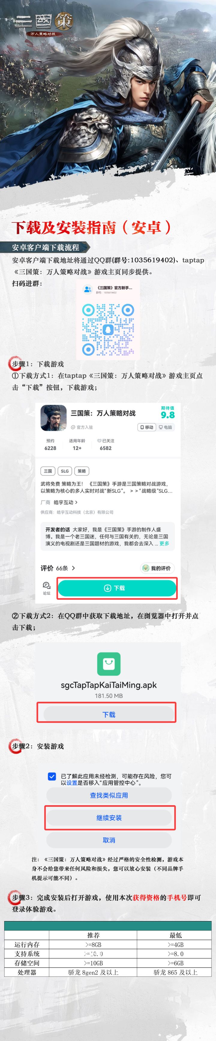 各位主公,《三国策:万人策略对战》 「首次内测」测试资格目前已全部发放完毕!为了方便各位主公在开服后能第一时间进入游戏驰骋疆场,我们已于今日(12月22日)15:00开通预下载通道~ 主公可按以下说明完成下载哦~1. 游戏客户端获取途径: 本次测试支持安卓/IOS/PC三端安装包下载,多端互通,所有端同一账号用同一角色。主公可通过两种途径获取下载链接:① taptap《三国策:万人策略对