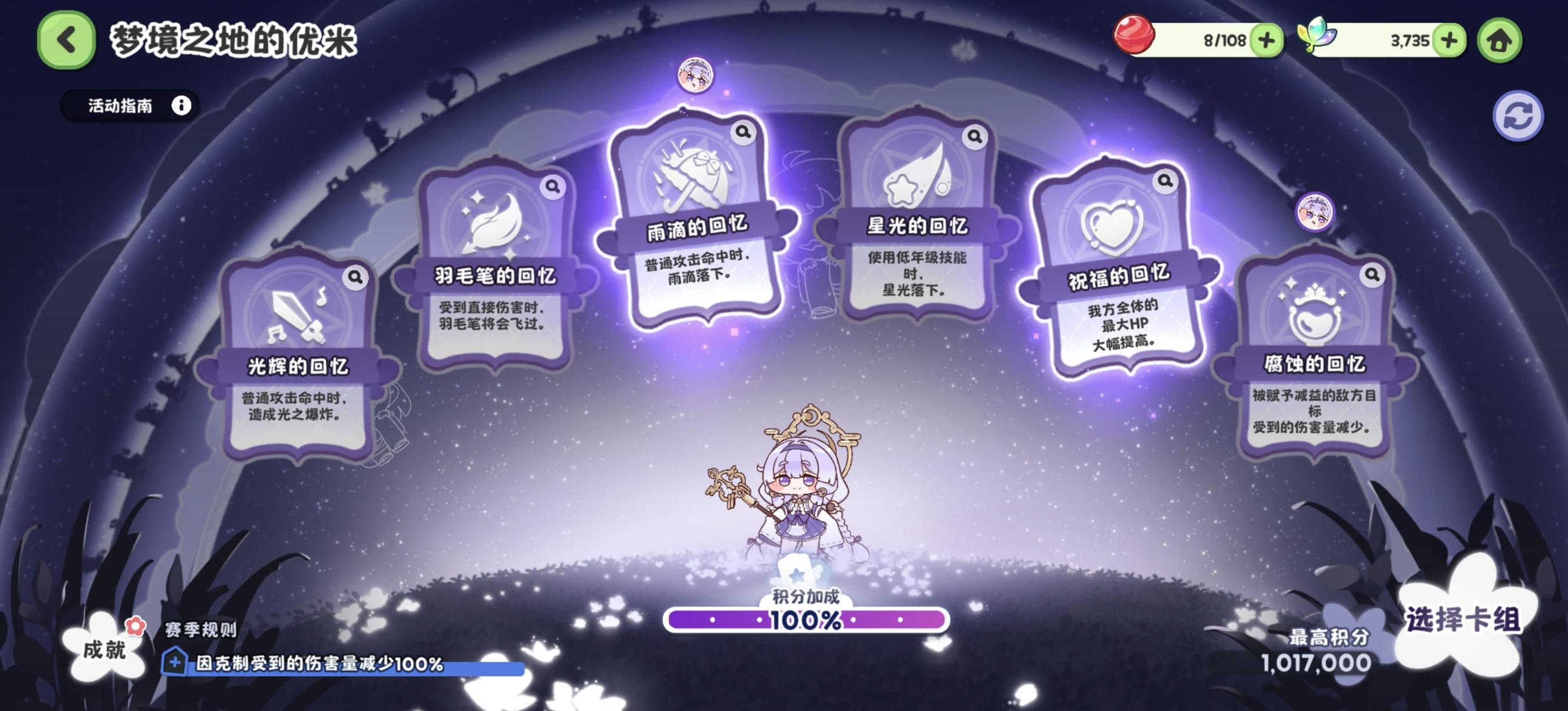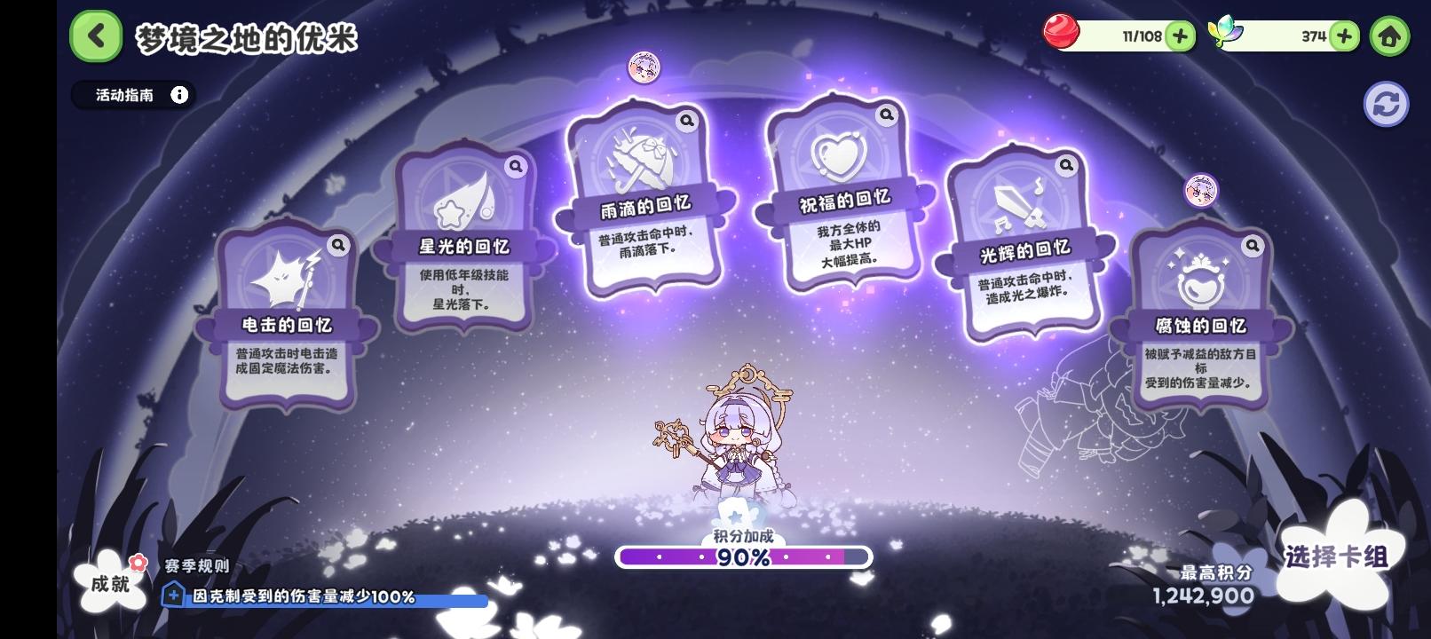 前言: 我发现活动的等级/星级/战力无关,重要是选择buff。(全程自动战斗除手动选卡)注解: 这个活动副本离不开(祝福的回忆)来加成,无论是怎样搭配,只要你不选择(祝福的回忆);当来到20万积分左右就会被熊人拿着鸡腿瞬间冲烂,侥幸通过也会有下一波给你冲烂。注解: 以上配队灵感思路翻阅早一期B站攻略UP,配队需要一只(当期UP!优米!)来提升buff伤害; 前排选择(龙人鲁德)来顶住一