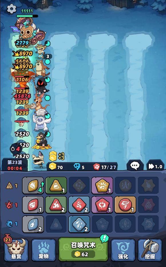 一、开局节奏把控(1-10波)1. 起手四连召: - 开局立刻召唤4次咒术(消耗初始金币) - 囤积金币优先将【召唤概率】升至3级(大幅提高高品质咒术产出率) 2. 悬赏与升级平衡: - 击杀首个200金币悬赏怪 - 继续升召唤概率至4级 → 囤金冲5级 - 若压力过大:暂停升级,补召咒术保生存 3. 流派选择关键: ⚡️ 水元素为版本答案! - 核心技能【暴风雪】:增幅所有水