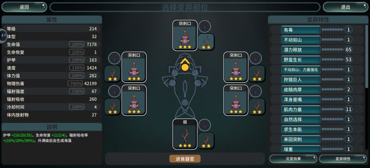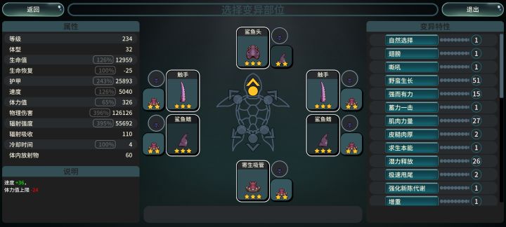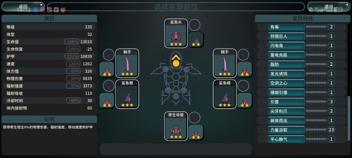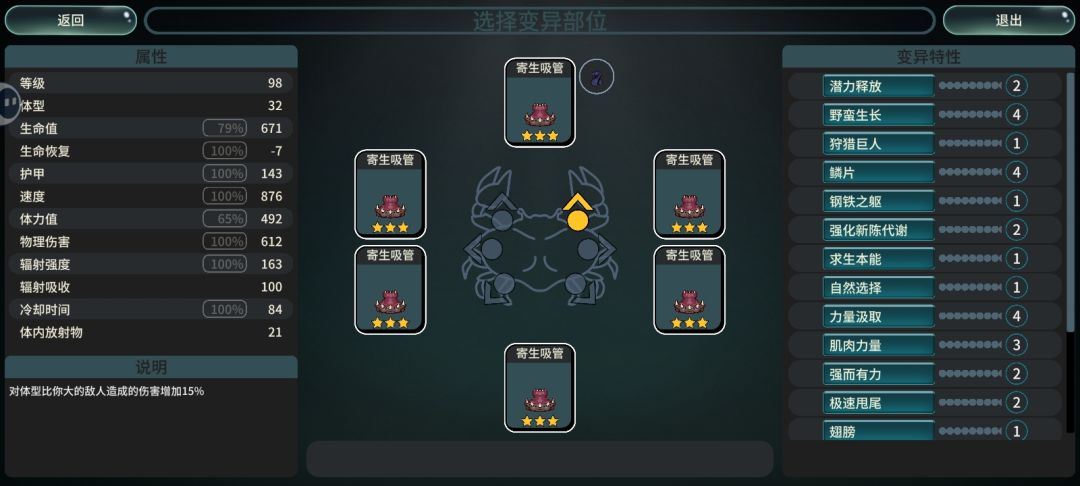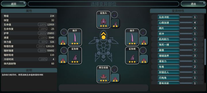 小龙虾比章鱼强太多了,昨天玩了一把无尽后期根本打不死怪,死不掉杀不死,没把怪杀了反而把游戏卡崩了搞得奖励都没了。 感觉小龙虾还可以提升好多,头搞个激光额外肢体再加俩小螳螂刀。 局外天赋最主要一个,升级禁天赋,局内很多有用的,不过要玩爽就要加掉血加攻击和速度,用血条换体力,螳螂刀加一刀,翅膀,吃肉加血上限等等……