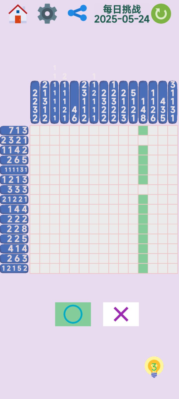 1. 同行或同列,所有的有色方块被找出的情况下,其他的x自动标出。2. 每日挑战,列谜面适配3. 考虑加入生命值,给玩家容错。下个版本,先改1和2。