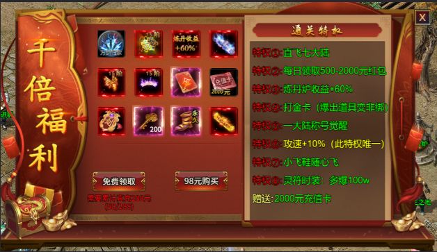 进入游戏第一件事,点击设置-礼包码兑换,输入礼包码:BXGB8888(20W灵符+50元充值卡)先不要买东西!这里给出一套小资起号攻略,大家一起进行参考!8元超值特惠+50直充=58元!8元超值特惠只有一个小时时间,过时不候,有仙阵+白银会员+宠物+八卦装备+巡航+千级礼包+80元充值卡,超划算!50元档位解锁两特权和红卡宝箱,特权全开,一键拉满!如果还有多的小钱可以拿来购买98元(真充2
