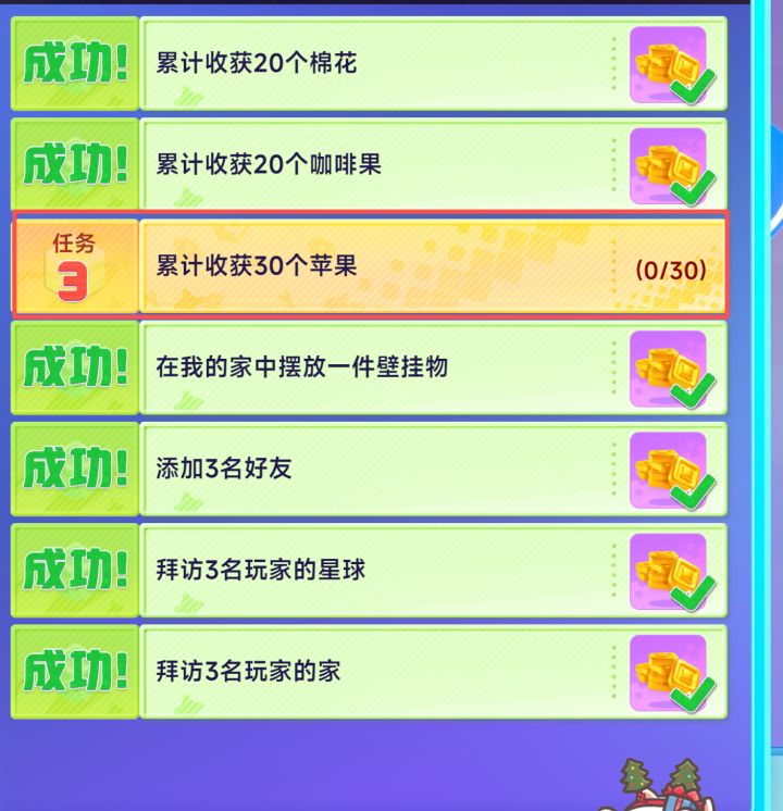 建设星球时,图方便把种了作物的农田(普通、花圃、果蔬)收回仓库,种下的种子直接消失并不会邮箱返还!!!收回时并不会提醒这种操作会导致作物消失!!!!(我损失了几十个小麦种子,咖啡和葡萄若干,各色花种若干,及5个苹果树)这一点本来已经打算认栽了,但今天翻“致富之路”任务查漏补缺时候发现这个第五天收货苹果的任务,因为上面的bug,我种下的苹果树全部消失了,商场里的树种种子并不会刷新,仍然是购买上限,