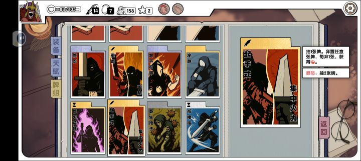 核心牌:后撤步凝神上面那俩属于这把没有基本就开不了的程度,二者之中只需一种一张即可,不过如果先出凝神后出后撤步,则依旧要选后撤步。与下面的其他牌共同出现时,优先选这两张,流水的输出铁打的辅。主力牌:罡风诱饵后手蓄势诱饵和后手看到就拿,罡风在进BOSS前的那两轮若还是没拿到后撤步或凝神,则需拿,其余情况不拿。主力装备:狂战头盔溢怒抽二,强力过牌,出了必选。输出牌:乘胜追击