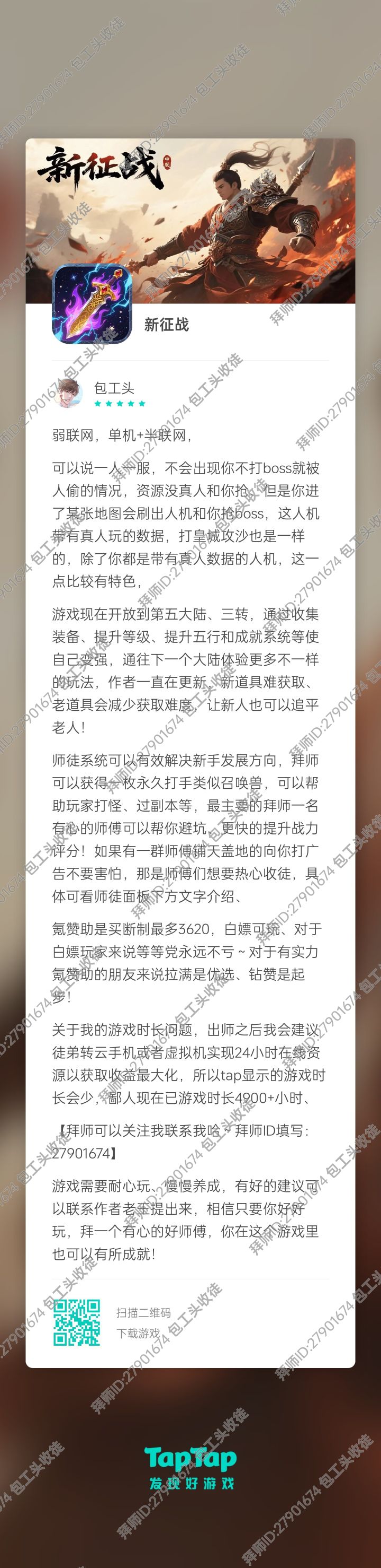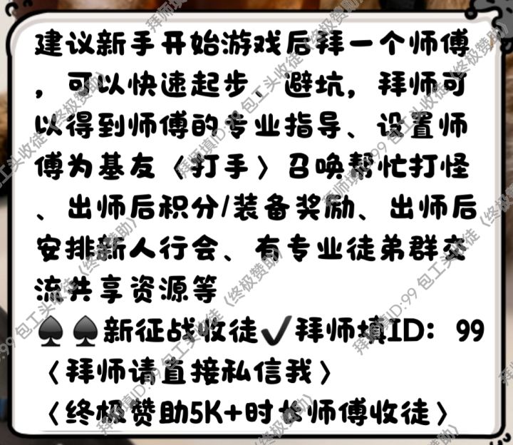 ✔万战、5K+小时时长老师傅〈终极赞助〉拜师填ID:99 新人优先拜师,好的师傅可以带你轻松游戏、注重细节!♠♠拜师后玩家以游戏左上角任务为主【游戏不可随意更换设备,固定一个设备玩,出师后建议转云手机 或者 可以24小时开机的电脑+远控app】重点:♠♠拜师后请保持联系!尊重彼此的时间!如长时间不能玩请告知师傅说明情况!【拜师后以下请照做↓】1.游戏里的设置按钮点开可看到修改角色昵
