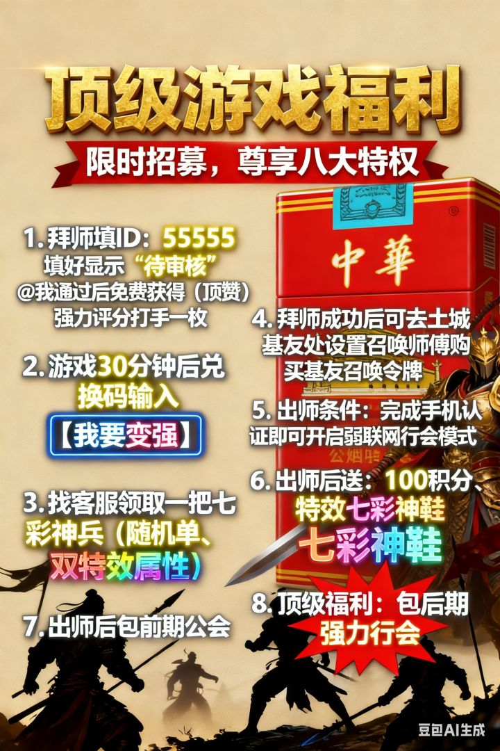 还在为开局没资源发愁? 还在为打怪被虐而苦恼? 别担心! 现在拜师填ID:55555 就能免费获得顶赞毕业强力打手 让你一路横推副本,所向披靡! 游戏30分钟后设置界面输入 “我要变强”兑换码 再找客服领取一把七彩神兵 助你战力飙升,横扫千军! 出师后更有100积分、特效七彩神鞋和强力行会等你加入!