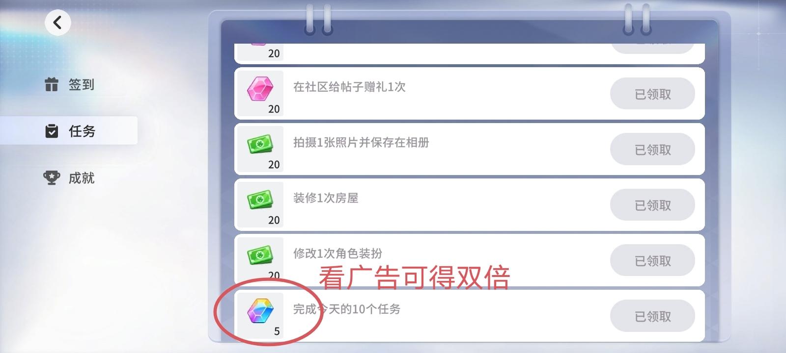 ⭕彩钻物品并不一定要氪金才能获取可以通过以下途径攒到彩钻①签到一个月累计 25②完成每日任务(看广) 5×2③每日奖励(需看广) 5⭕一个月统共可获得25+30×(5×2+5)=475#尤雅时光