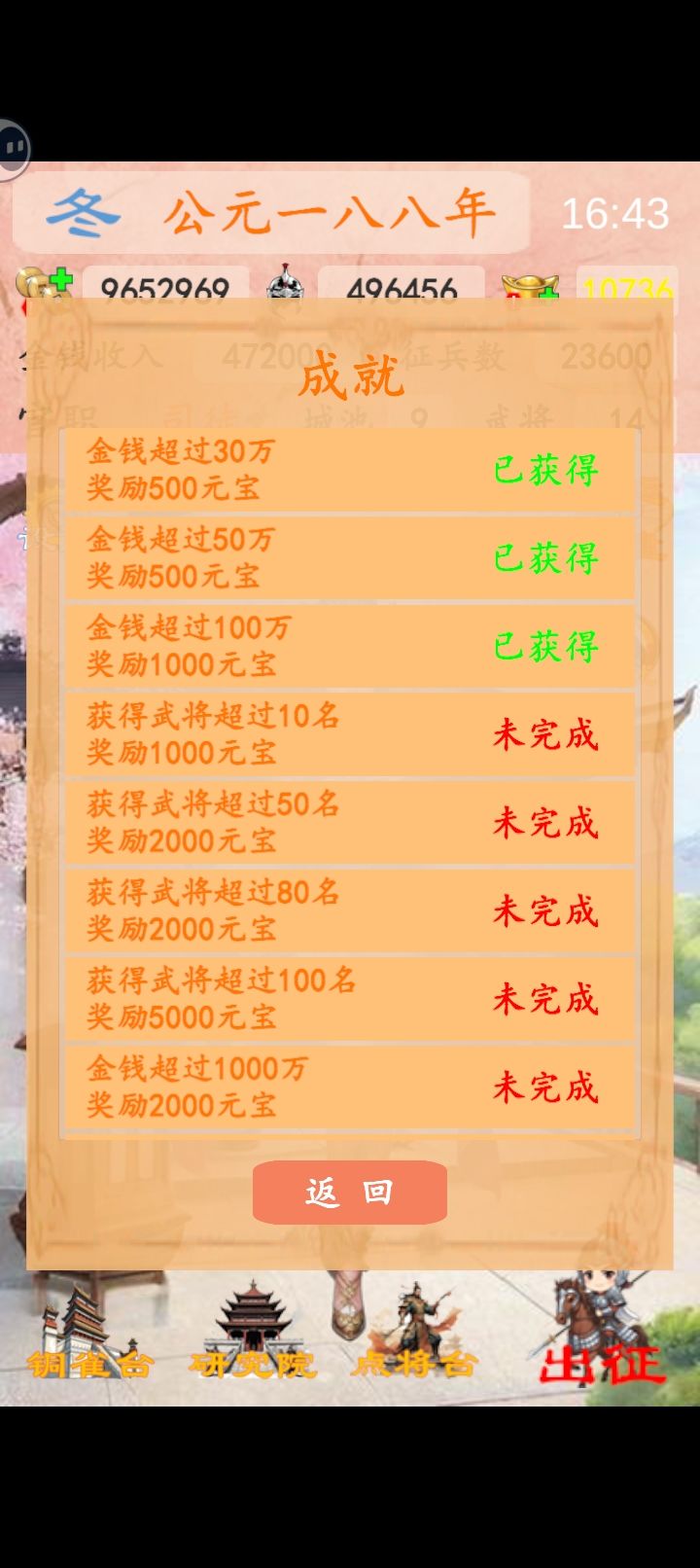 1.8版本是坑我通关了带了吕布统一也没生效是BUG吗又重新安装1.0版本重玩才生效Bug相当多后期全是已死亡武将成就能过就有鬼了策划也是个傻雕bug后期数据膨胀没百分比伤害一局可以打一天后期尸体一大堆这是我玩过最差的游戏?