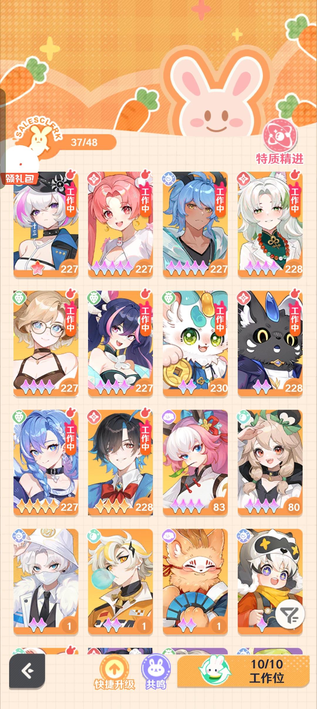 个人的一些简单游戏经验分享给大家首先是资源分配,前期彩萝币也好嘻嘻币也好都很容易获取,但彩萝币尽量不要乱用,等大活动时用来买道具,比较推荐的大活动是踏青和浪花,奖励多且比较容易达成。嘻嘻币能攒尽量攒一点,后面种花做花的话花起来如流水。其次是店员的抽取和培养,神秘档案全凭运气,但白金档案可以指定up,个人推荐优先抽取甜莓特质店员,五甜莓是目前最好凑的卡组,后面花艺给的加成很大,打沙盘会容易许多
