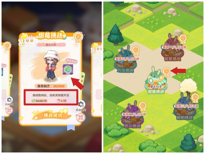 11月13日更新推出了新玩法[特质秘境]店铺满65级后,进入[沙盘]在美食仙人旁找到每种特质挑战有对应的开放时间用对应特质店员(最多5位)进行厨艺挑战年卡可以自动挑战 普通玩家只能手动推关了每关有首次挑战奖励包括: 嘻嘻币/萝卜汽水/神奇星砂/ 随机紫色厨具盒/特质秘卡(*新出的)只要存在推关进度 就会以最高关卡进行自动挂机挂机奖励秘卡和共鸣证(都是新道具 还没开放用法)挂机
