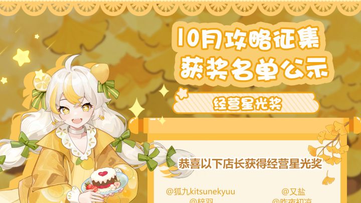 小店来了新朋友~每一天都很热闹!感谢店长们根据自己的心得产出的篇篇攻略,为无数新店长提供宝贵的指引!10月份的攻略创作激励已经结束,在小镇评委们的精心评选之下,本次的获奖名单出炉啦~活动奖励将在3个工作日内发放到游戏中的邮箱,请各位获奖的店长注意查收。没来得及参与活动的店长也不要灰心,解忧小店的经营还在继续!#休闲游戏 #发现好游戏 #模拟经营 #解忧小食光#游戏日常