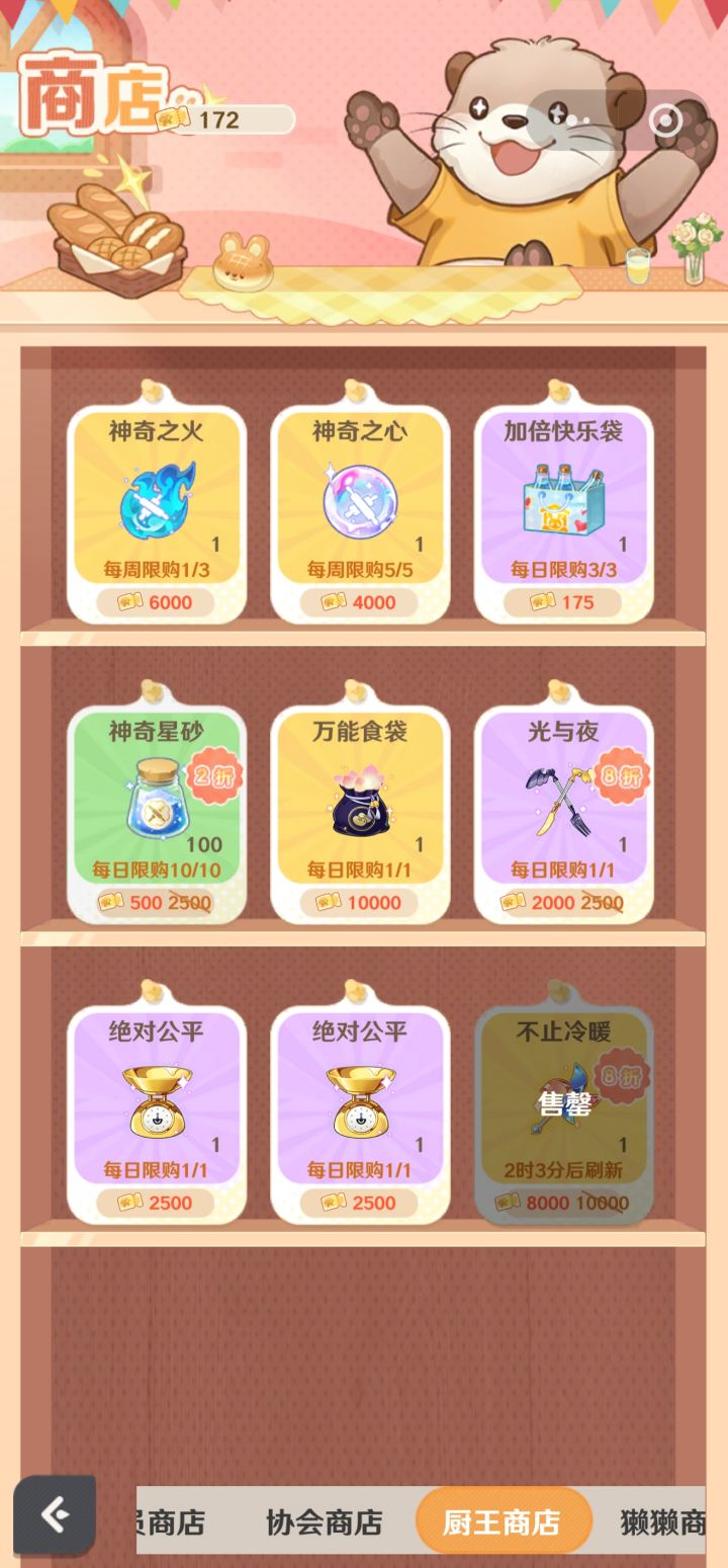 #解忧小食光攻略 1,百货商店,优先购物特级店员碎片,及嘻嘻币货物,其余按需购物(不建议)2,聚会商店,优选店员碎片(仅北辰与碎米儿)根据主攻特质选取,次选糖果。其余不建议3,店员商店,购买主动特质的特级店员,其余不建议4,协会商店,优选灵魂裱花。有急需时,按需购买。5,厨王商店不是特别了解,解锁第一名优选神奇之火,次选不止冷暖与神奇之心6,懒懒商店:非氪勿购7,花园商店:必买晨语种