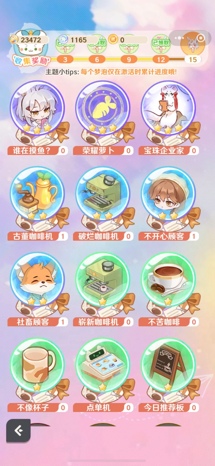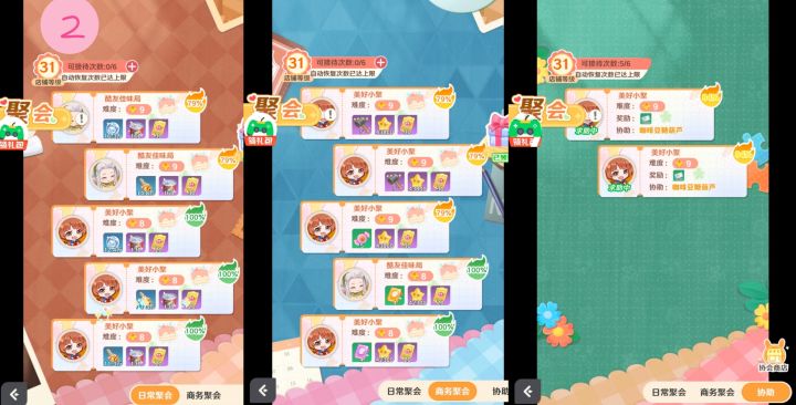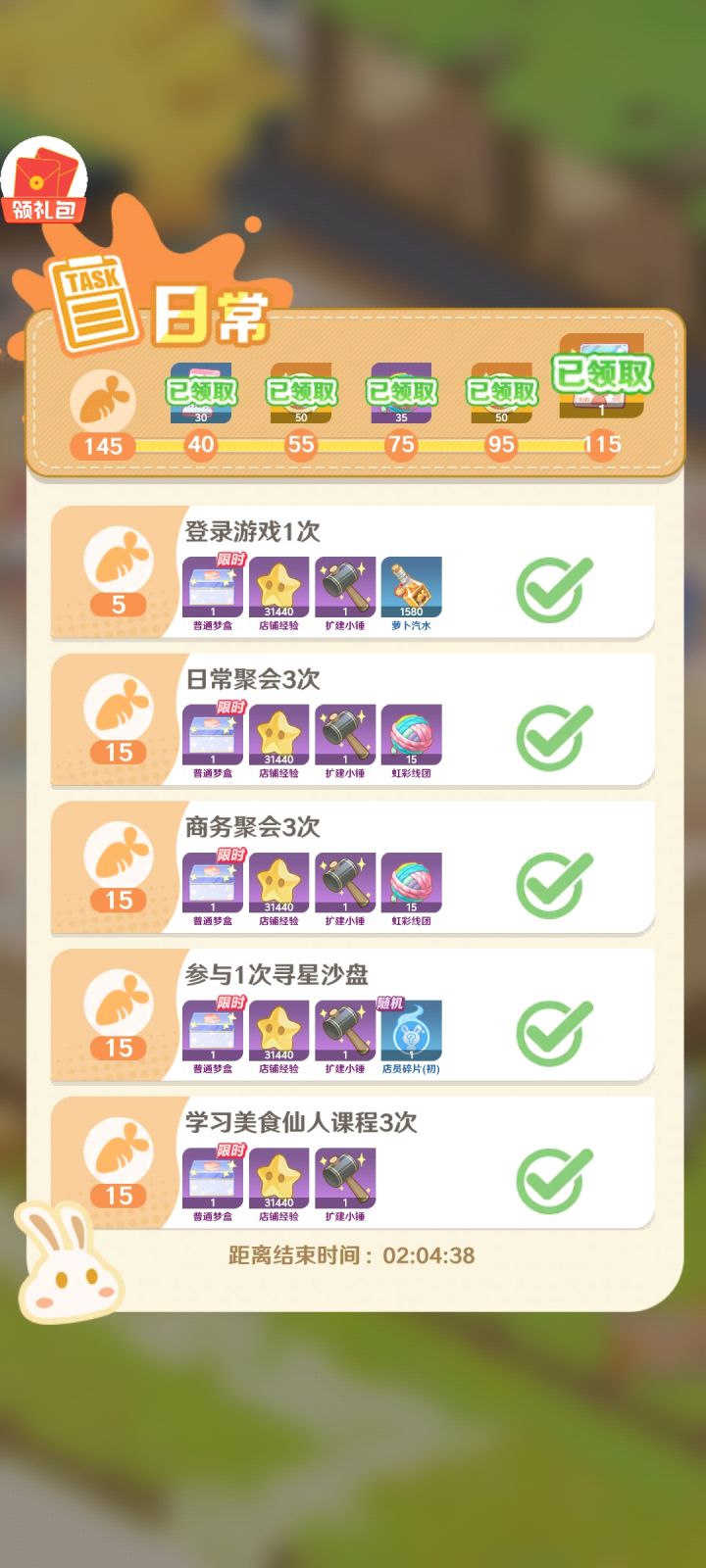 日常 有五个奖励点,做下面发布的任务获得胡萝卜数值,数值到达115可解锁所有奖励点聚会 有三个聚会,日常聚会、商务聚会和协助,各6个接待次数,可获得不同奖励协会订单 接取订单,获得协会点得到奖励,记得兑换600协会点奖励,注意订单一次只能接一单活动 奉行哪里亮了点哪里原则,都给我点一遍#游戏攻略 #解忧小食光 #解忧小食光攻略 我的游戏UID:511#14684