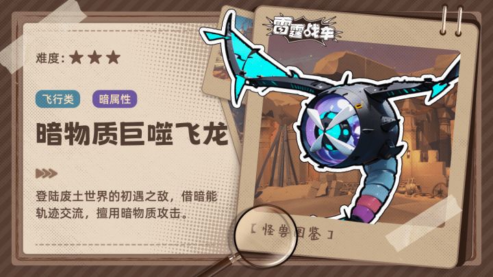 ⚠️警告!所有穿越者请注意❗❗❗这片废土中危险的不仅是沙暴与干涸,那些因未知原因扭曲而成的怪物☠️,才是真正的死神!今日情报官将为您解密两种初期高危怪物,生存指南📄发放中……「暗物质巨噬飞龙」废土世界的初遇之敌,是一位值得尊重的对手。「黑曜石收割者」“疾速”的代言词,凶猛的外表下或许藏着一颗对黑夜畏惧的心?(🤔)穿越者,这份档案将同步至您的车载AI。🚗下一次遭遇它们时,记住——废土